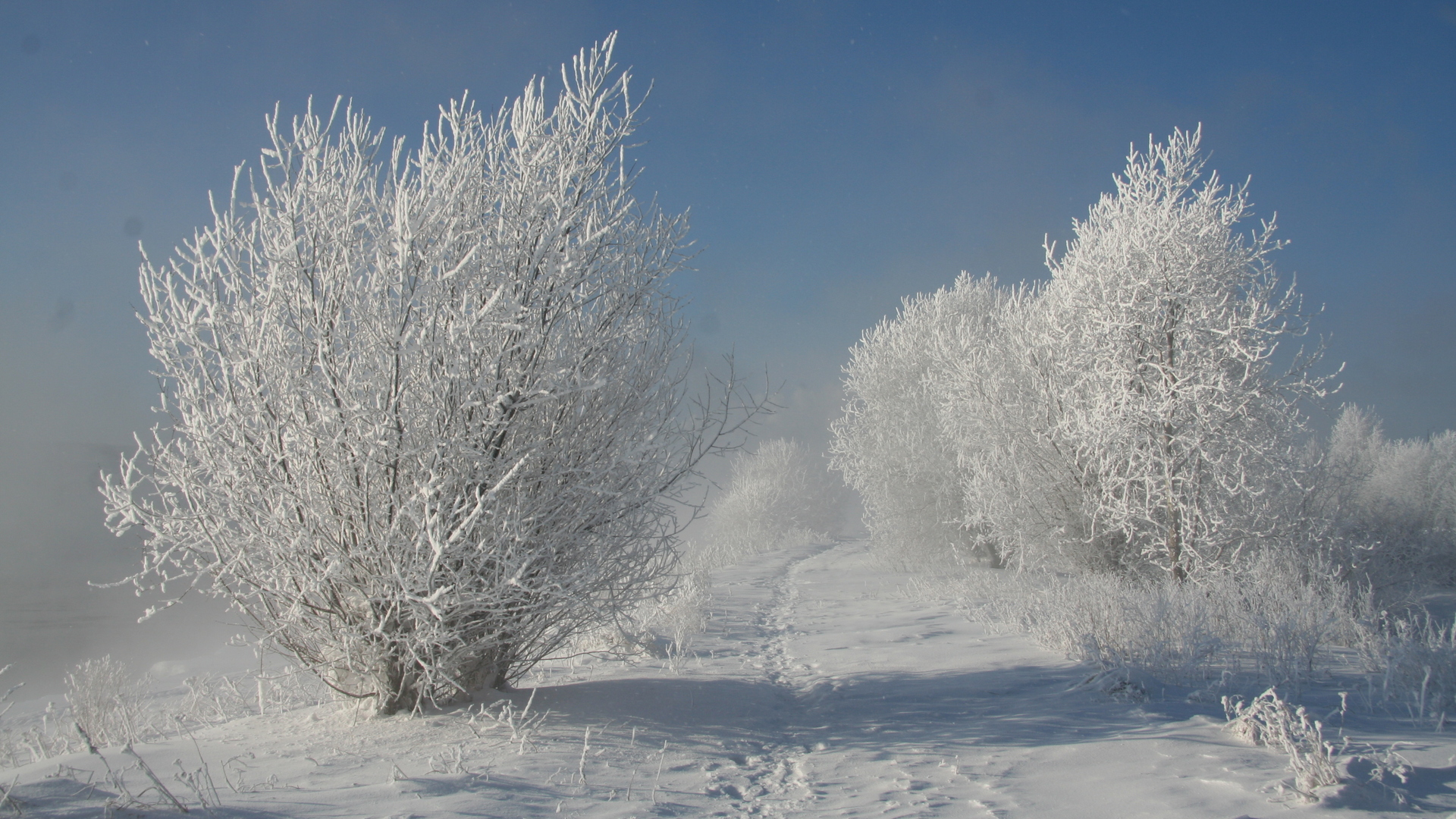 Description: A snowy path with trees and bushes covered in snow on a sunny day with a blue sky in the background.