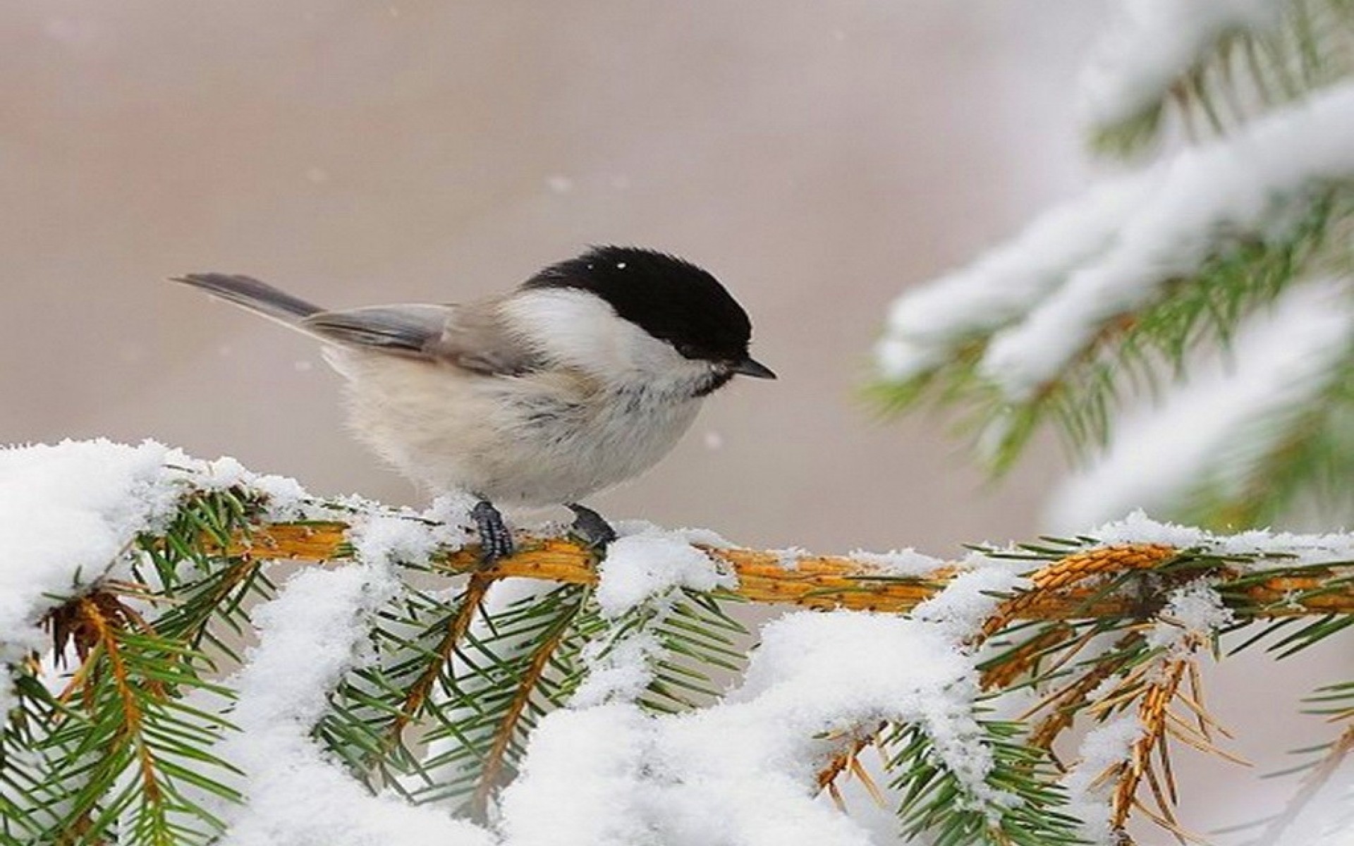 Description: A bird perched on a branch of a pine tree covered in snow and pine needles with a light brown background.