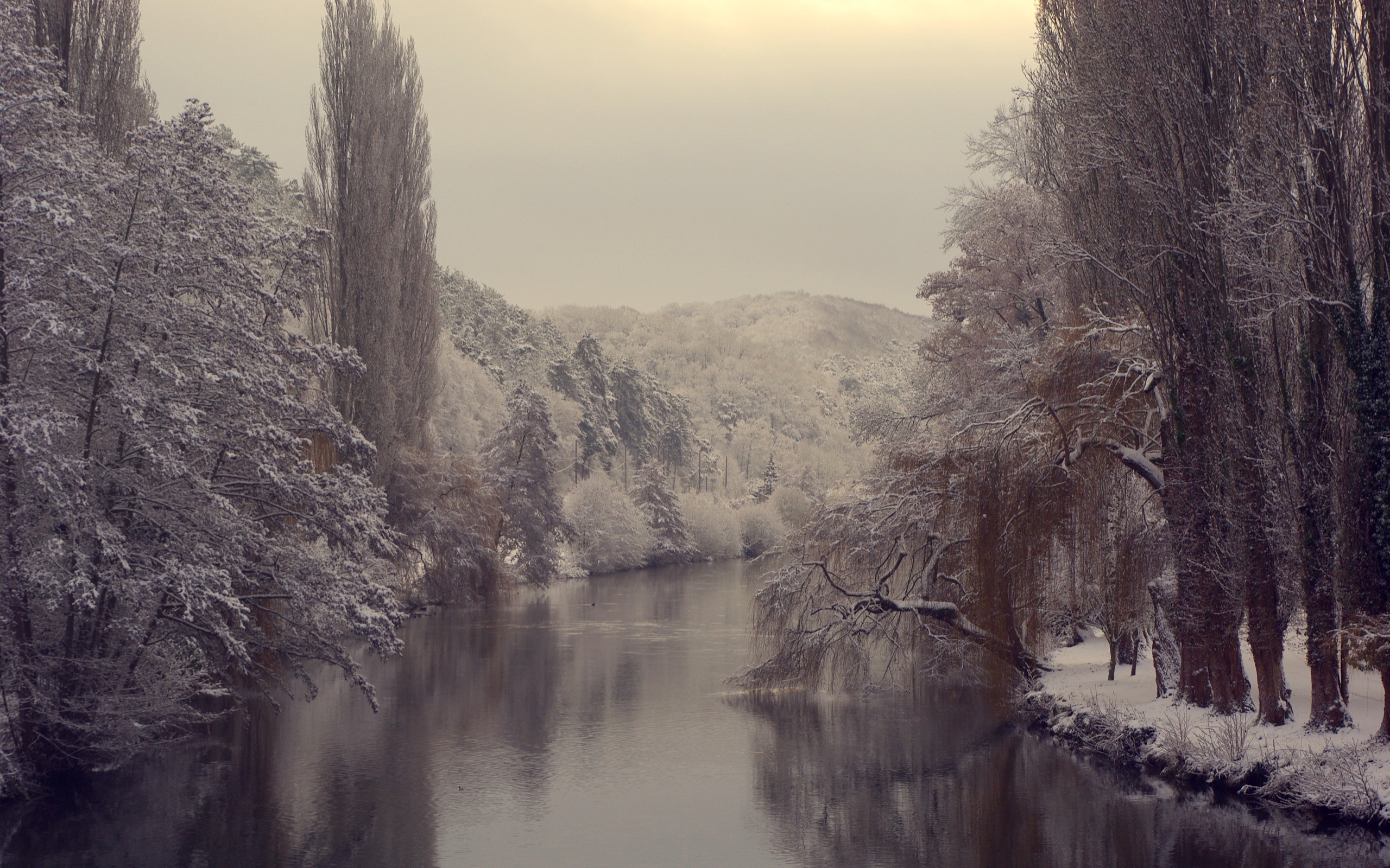 Description: A river surrounded by trees covered in snow next to a forest covered in snow covered trees and a hill.