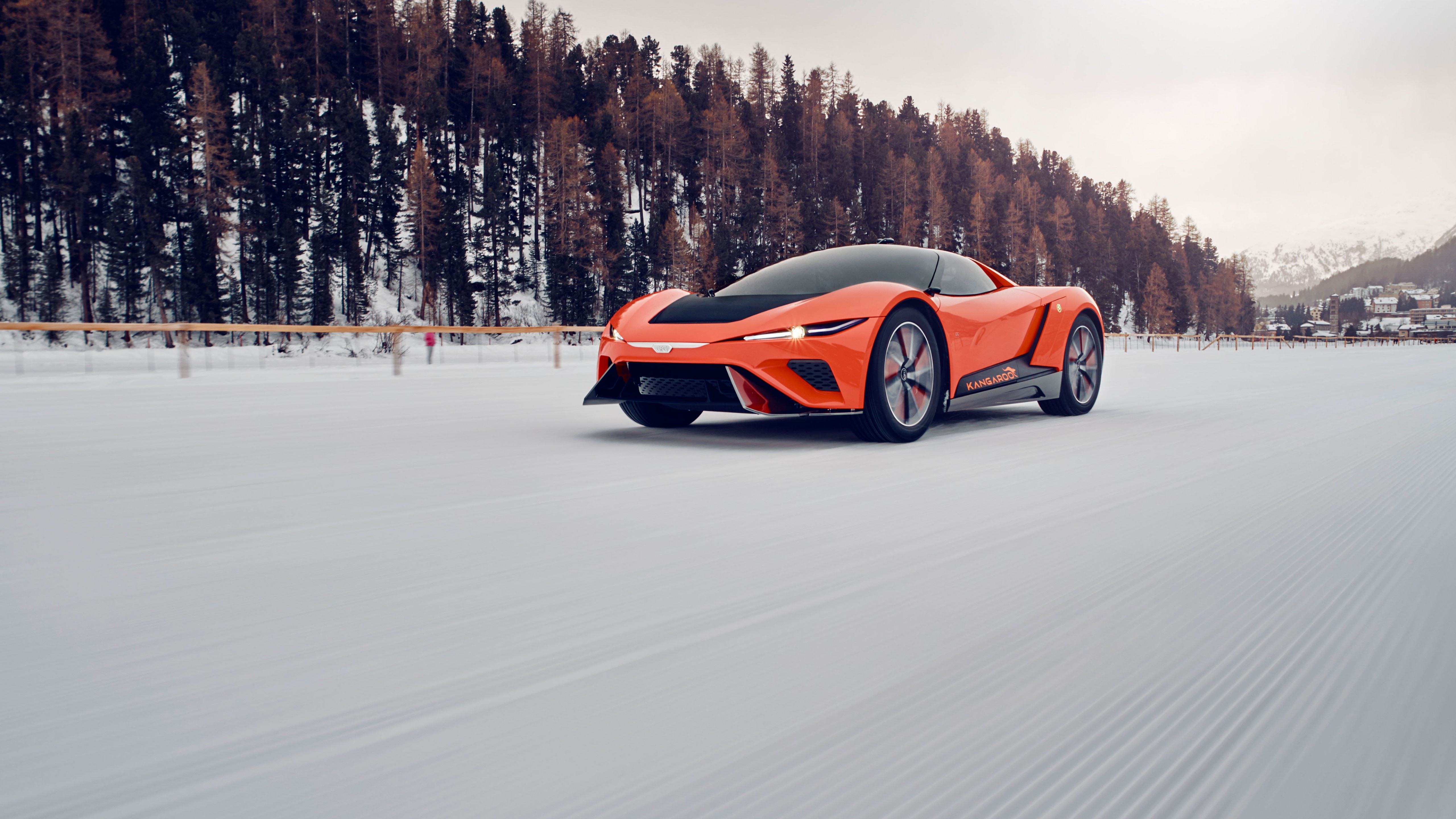 Description: A car driving on a snowy road near trees and a forest in the background with a sky background and a line of trees.