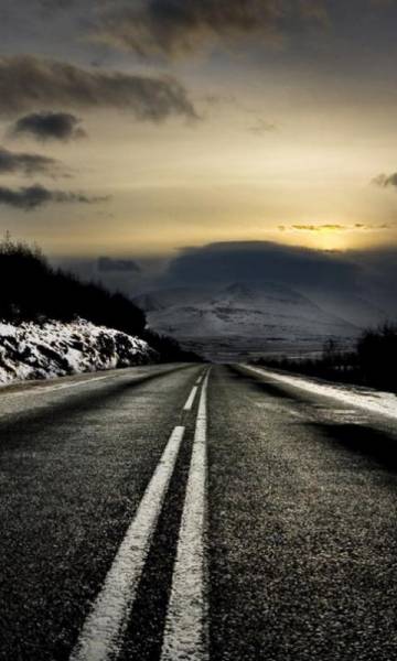 Description: A road with snow on the ground and a mountain in the distance with a cloudy sky above it and a line of snow on the ground.