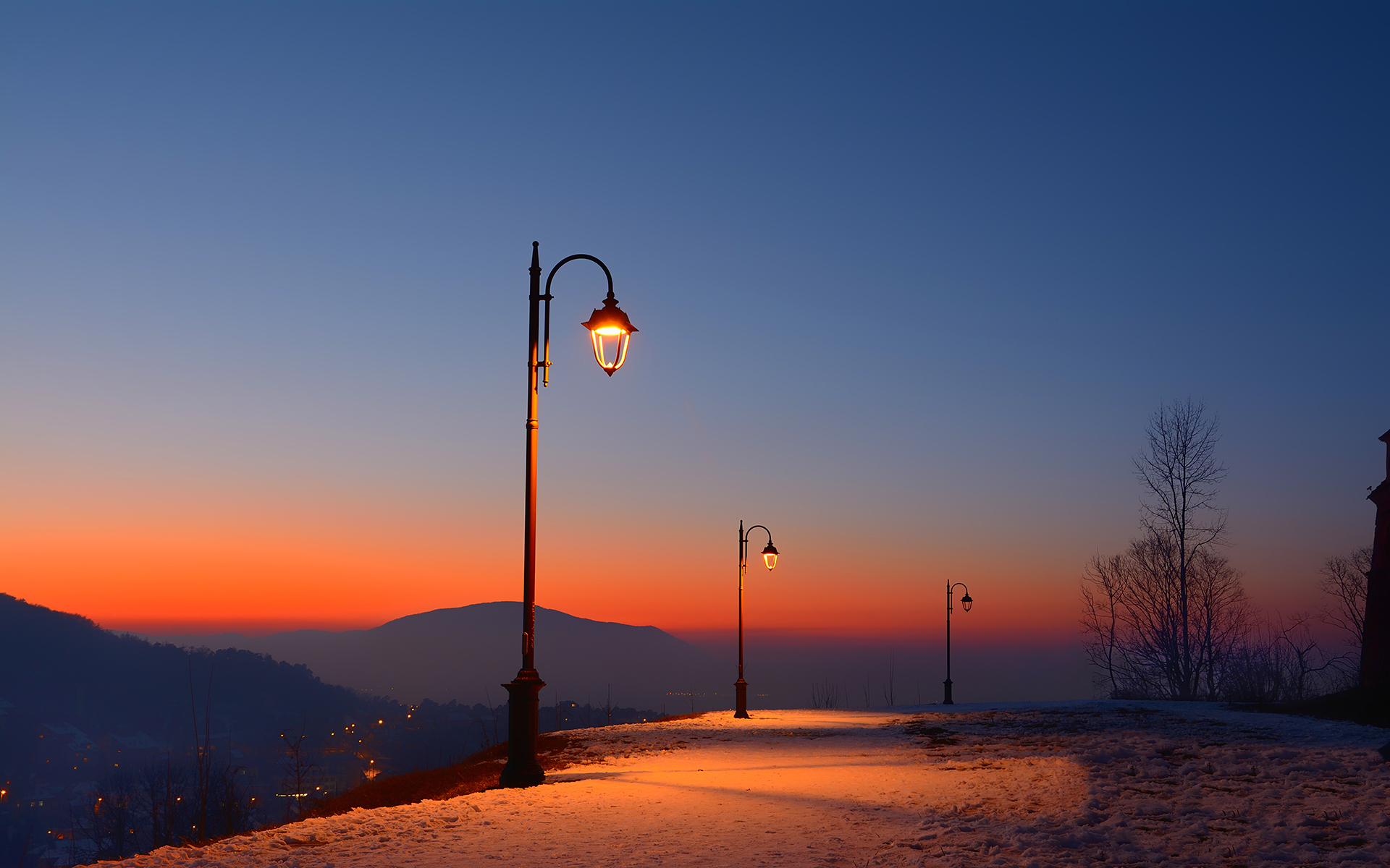 Description: A street light on a snowy road at sunset with a mountain in the background and a light pole in the foreground.