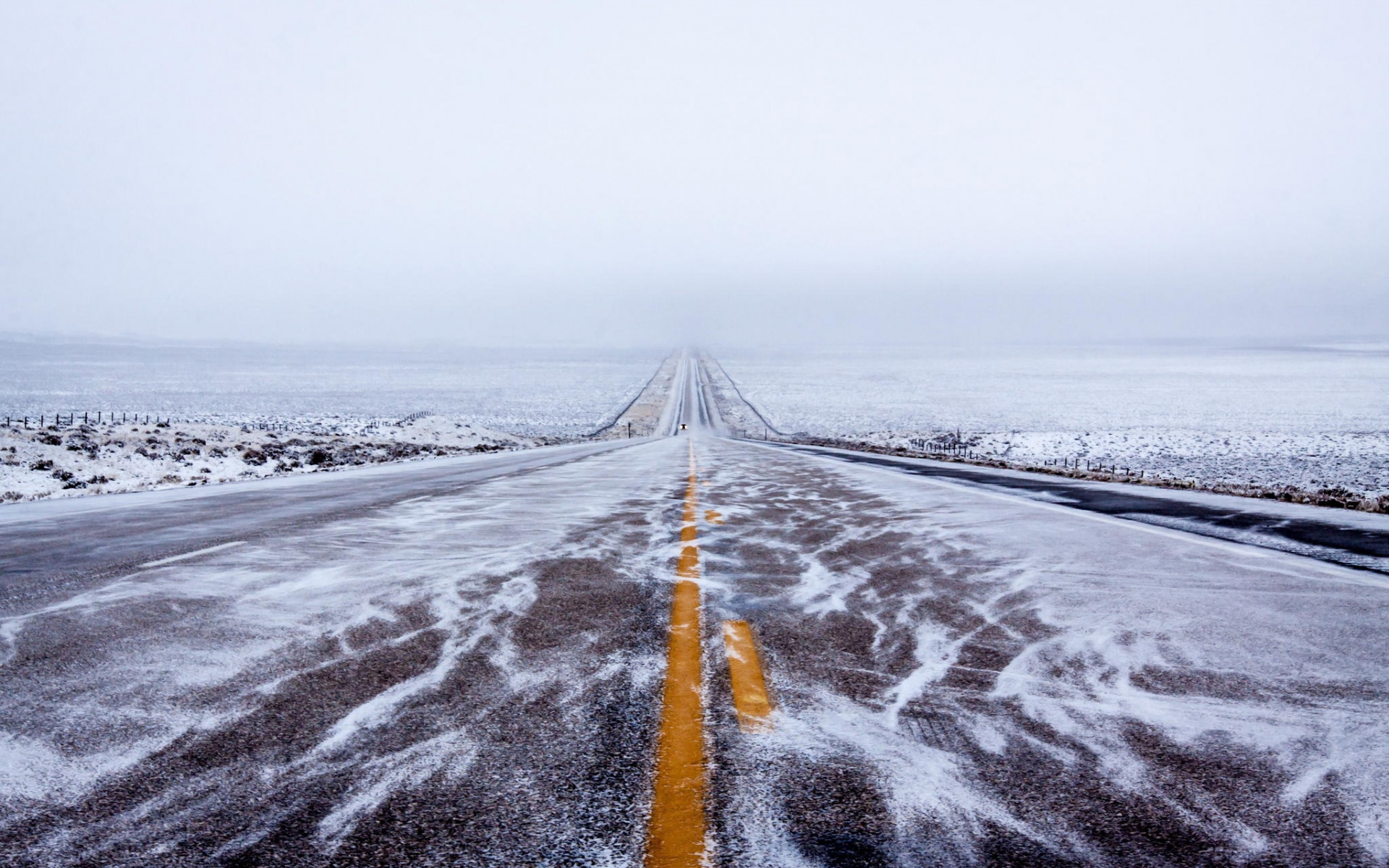Description: A long road with snow on the ground and a sky background with a few clouds in the distance and a yellow line in the middle.