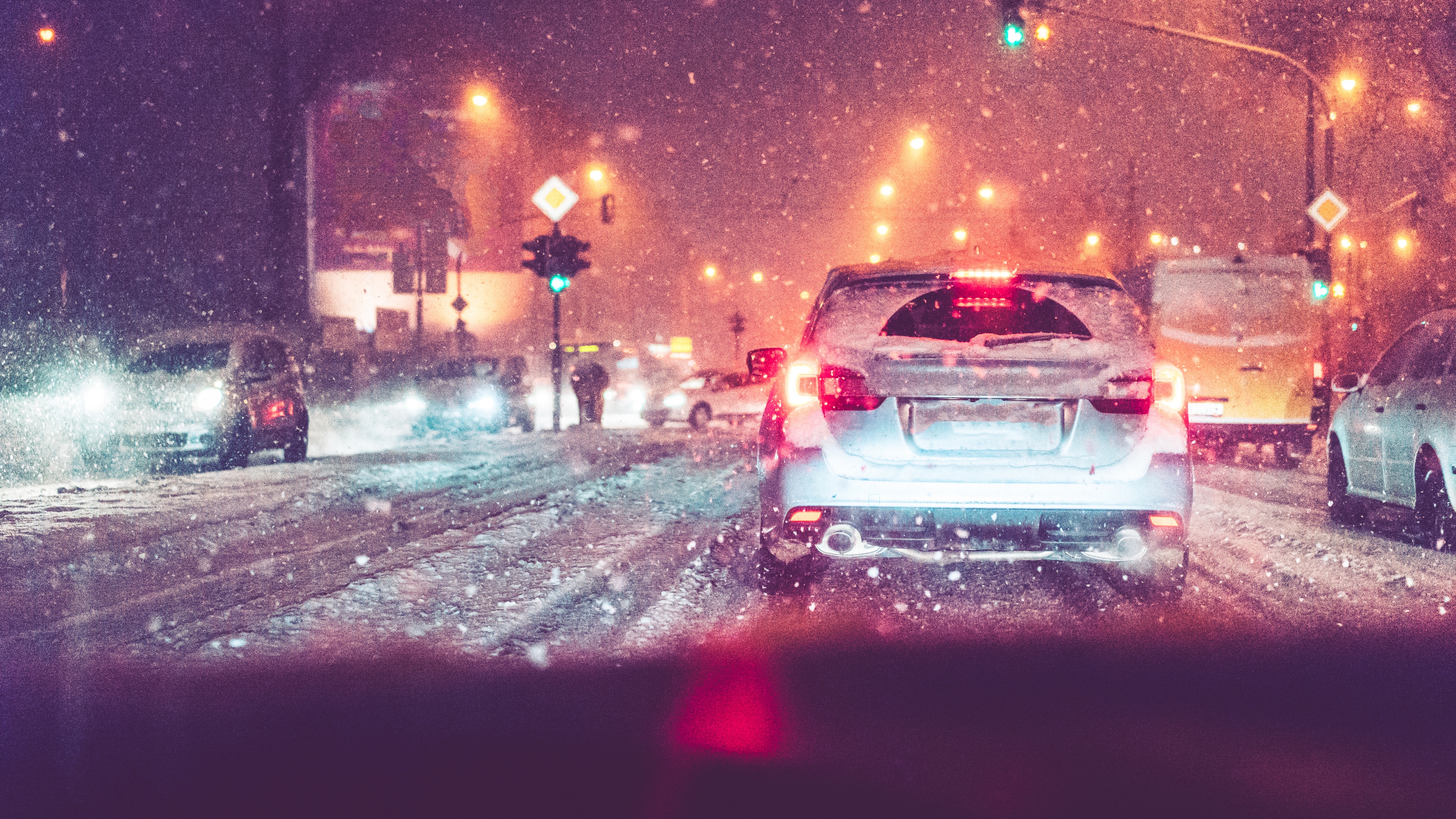 Description: A couple of cars that are sitting in the snow together in the street at night time.