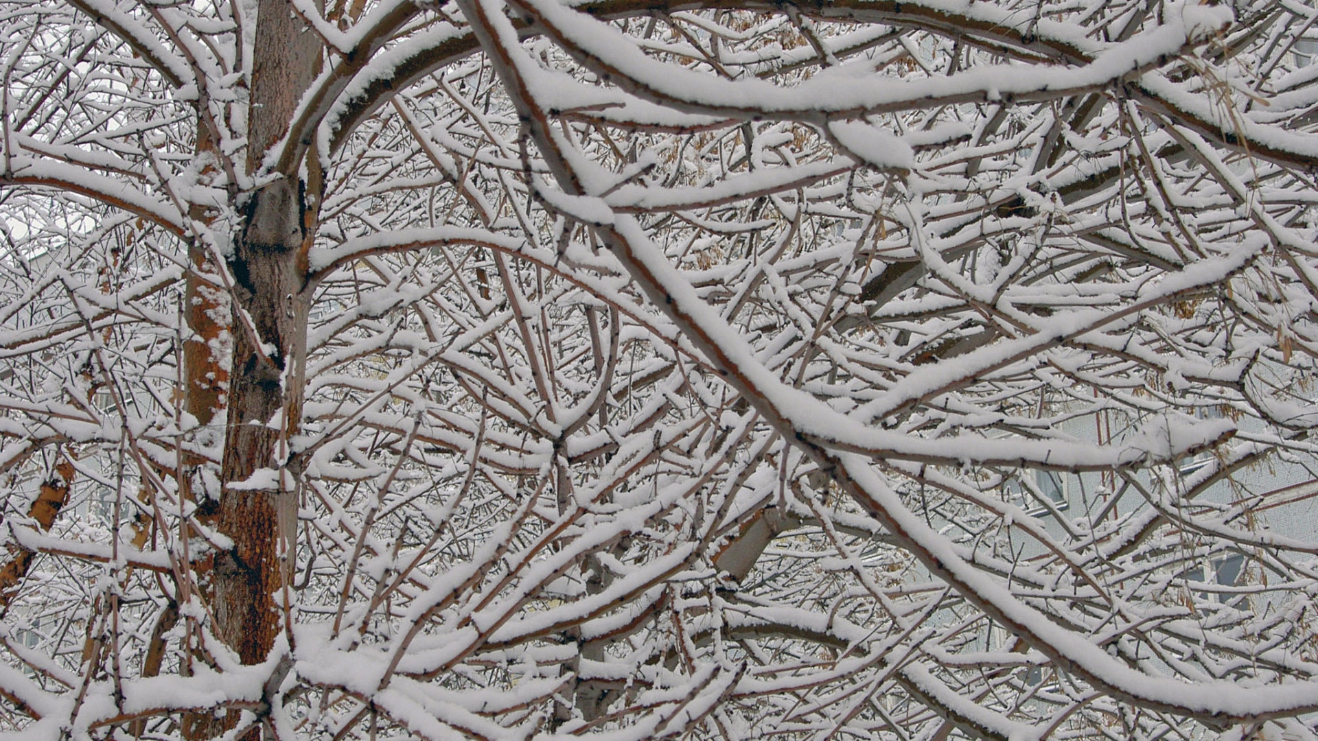Description: A tree covered in snow next to a forest filled with trees and branches with no leaves on them and a bird perched on a branch.