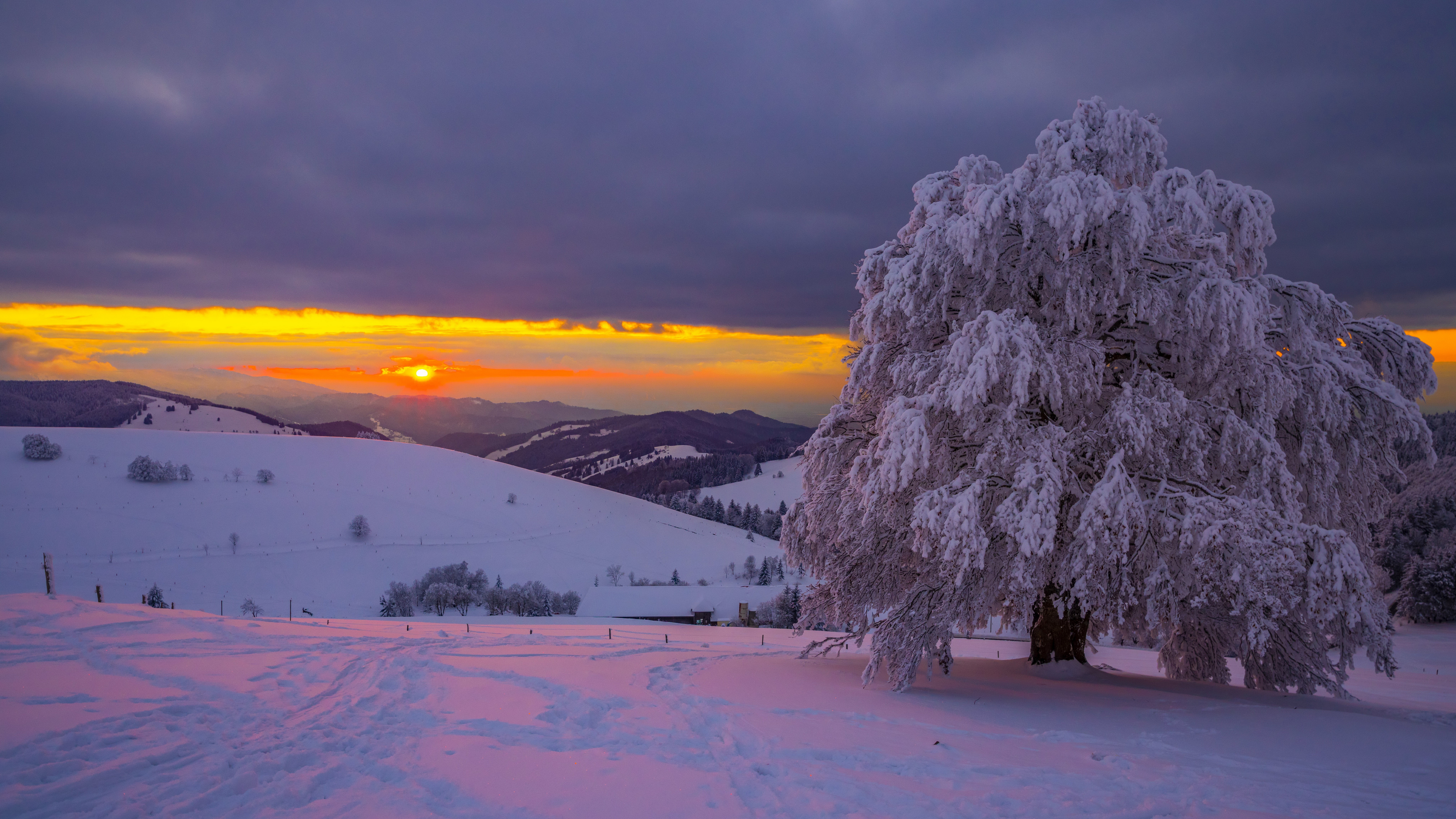 Description: A tree covered in snow with a sunset in the background and a mountain range in the distance with a snow covered hill.