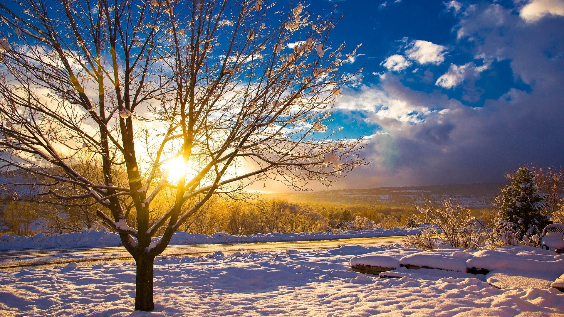 Description: A tree in the snow with the sun shining through the clouds in the background and a road in the foreground.