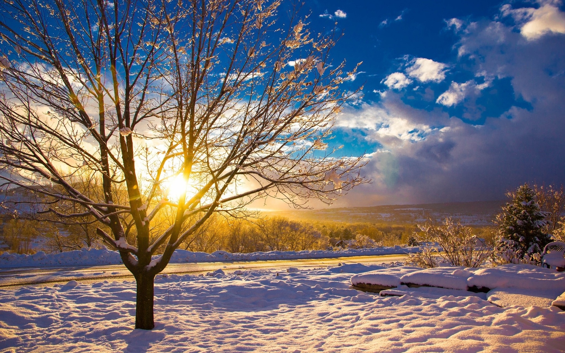 Description: A tree in the snow with the sun shining through the clouds in the background and a road in the foreground.