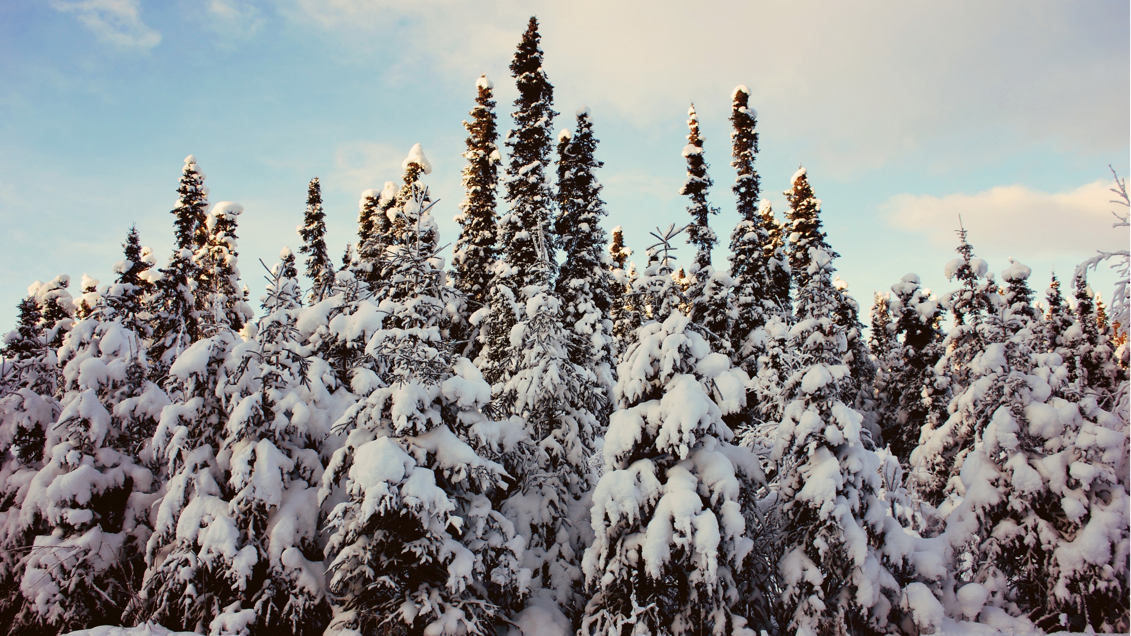 Description: A group of trees covered in snow under a blue sky with clouds in the background and a few snow covered branches.