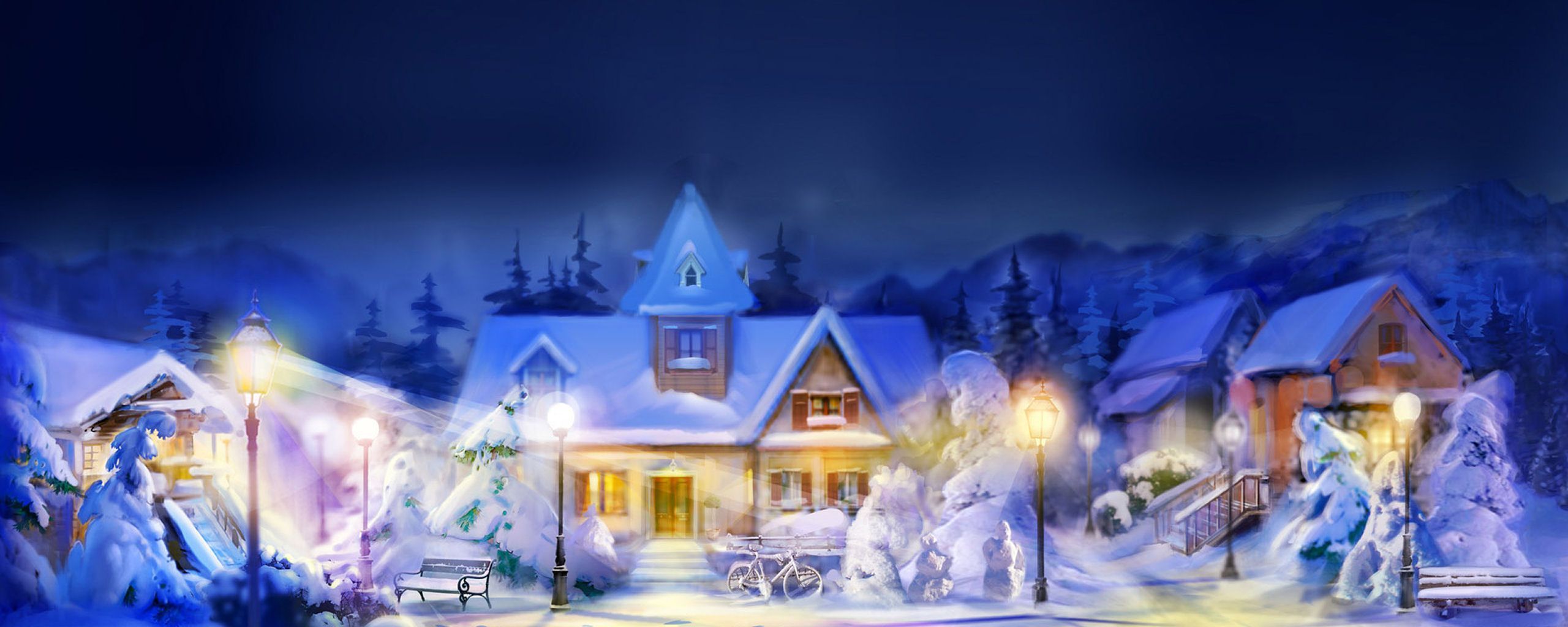 Description: A painting of a snowy village with a church and a church steeple at night with a light on.