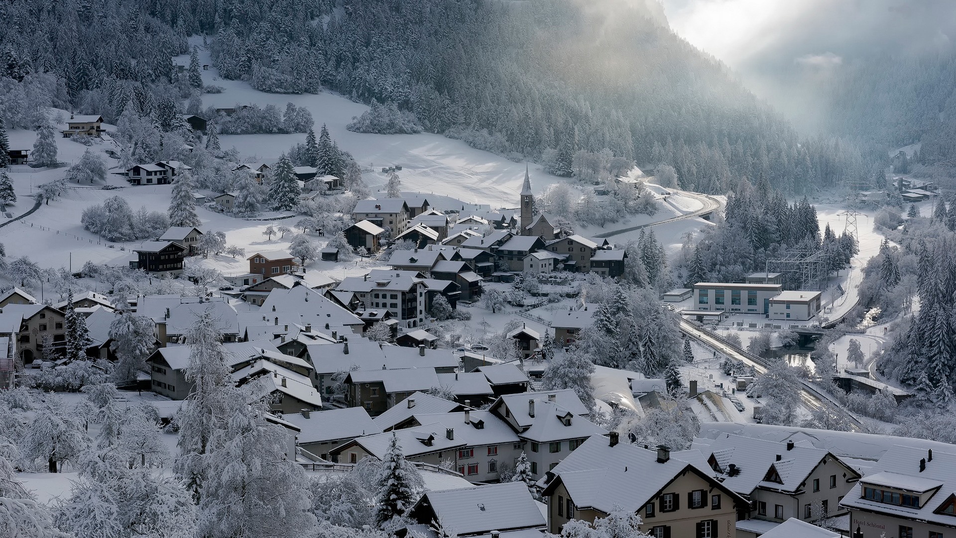 Description: A snowy village with a mountain in the background and a cloudy sky above it.