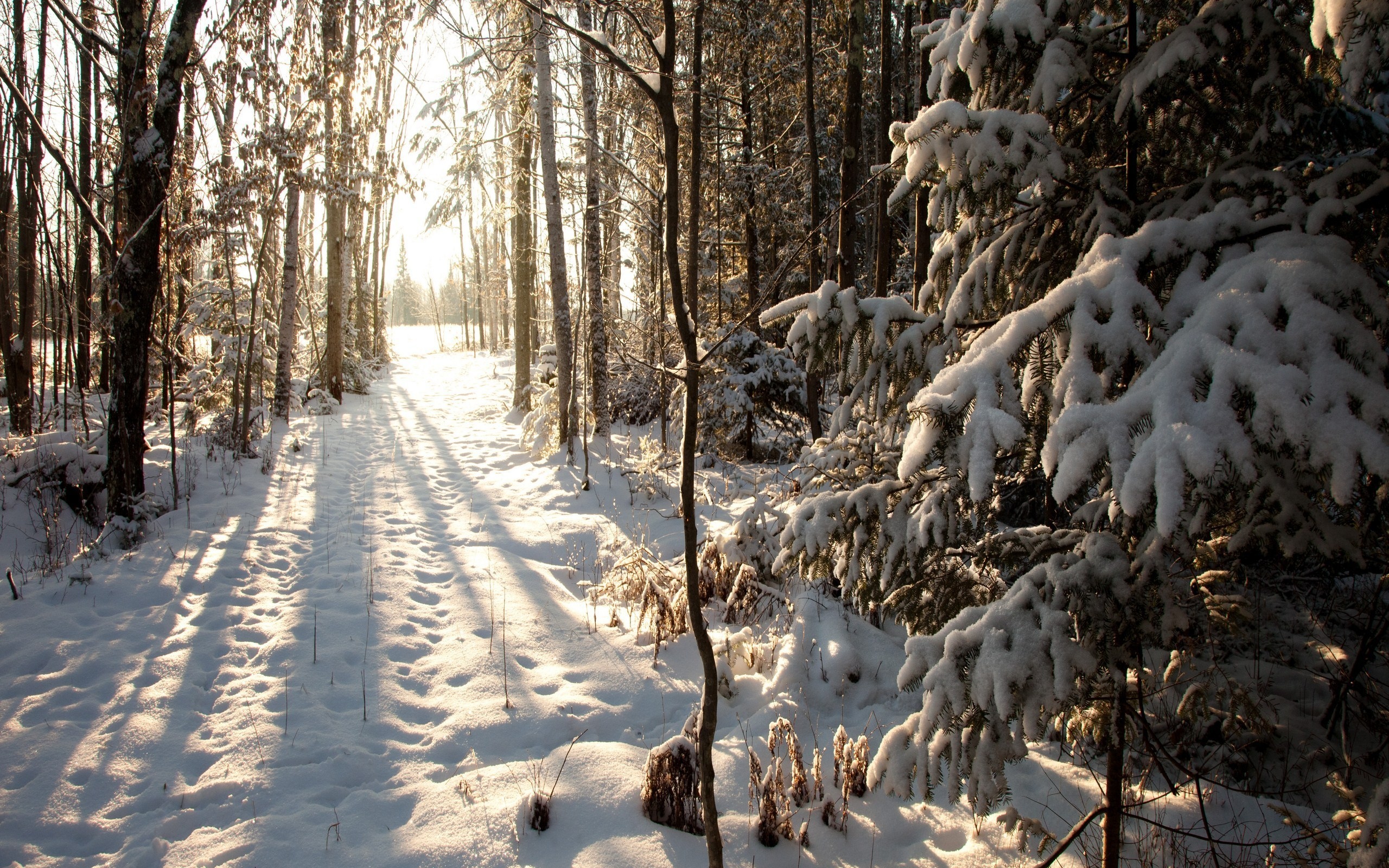 Description: A path in the woods covered in snow with trees in the background and sun shining through the trees on the right.