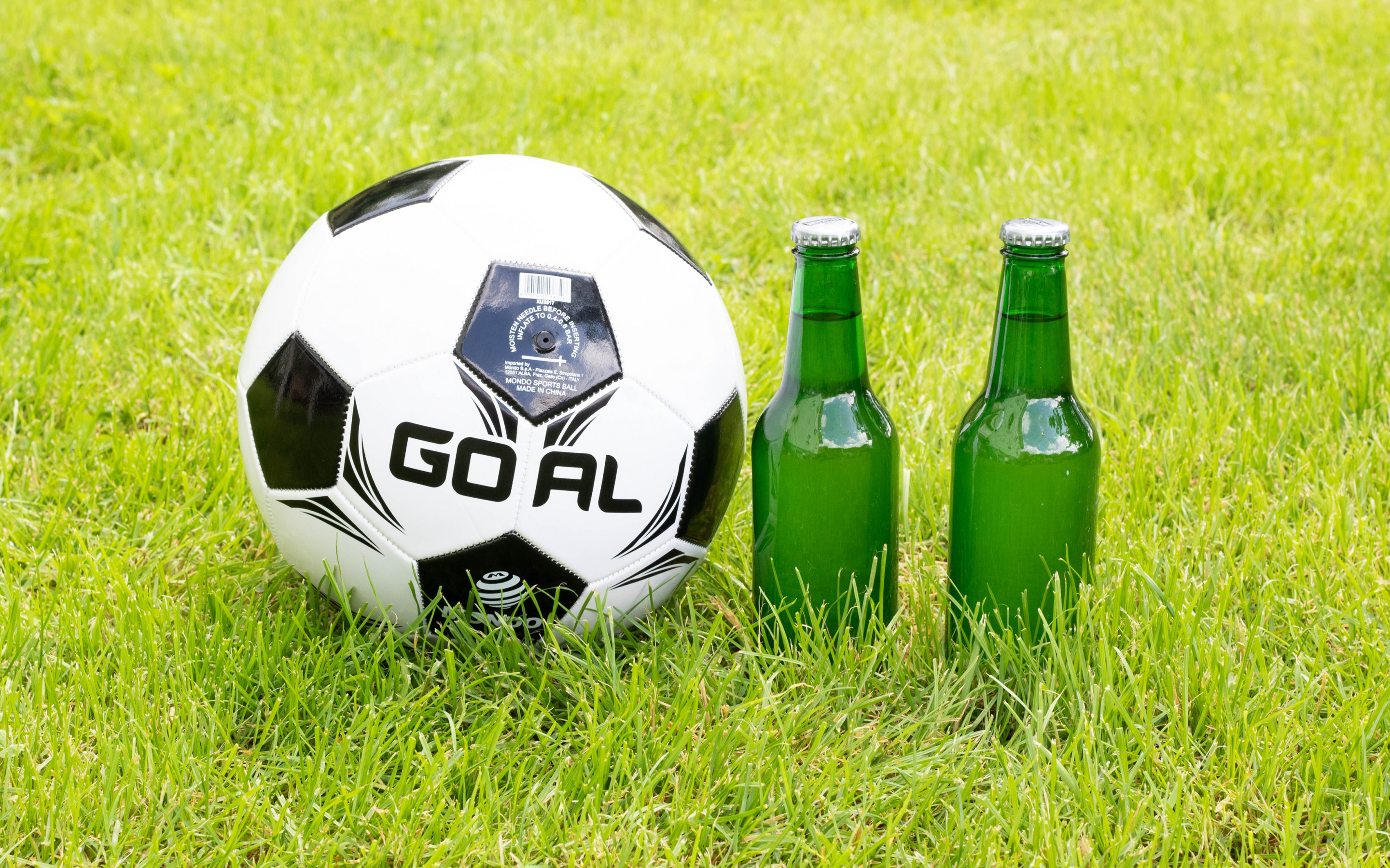 Description: A soccer ball and two bottles of beer on the grass with the word goal written on it and the ball on the grass.