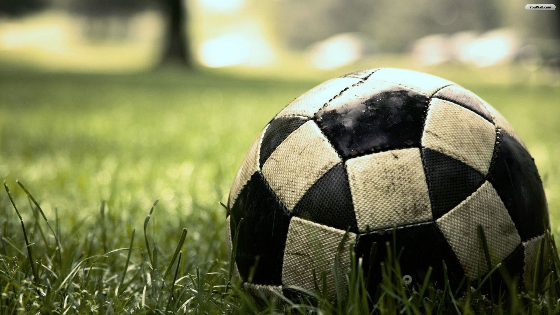 Description: A soccer ball sitting in the grass in a park area with trees in the background and a blurry background.