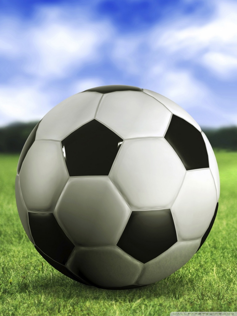Description: A soccer ball sitting on top of a lush green field of grass with a blue sky in the background.