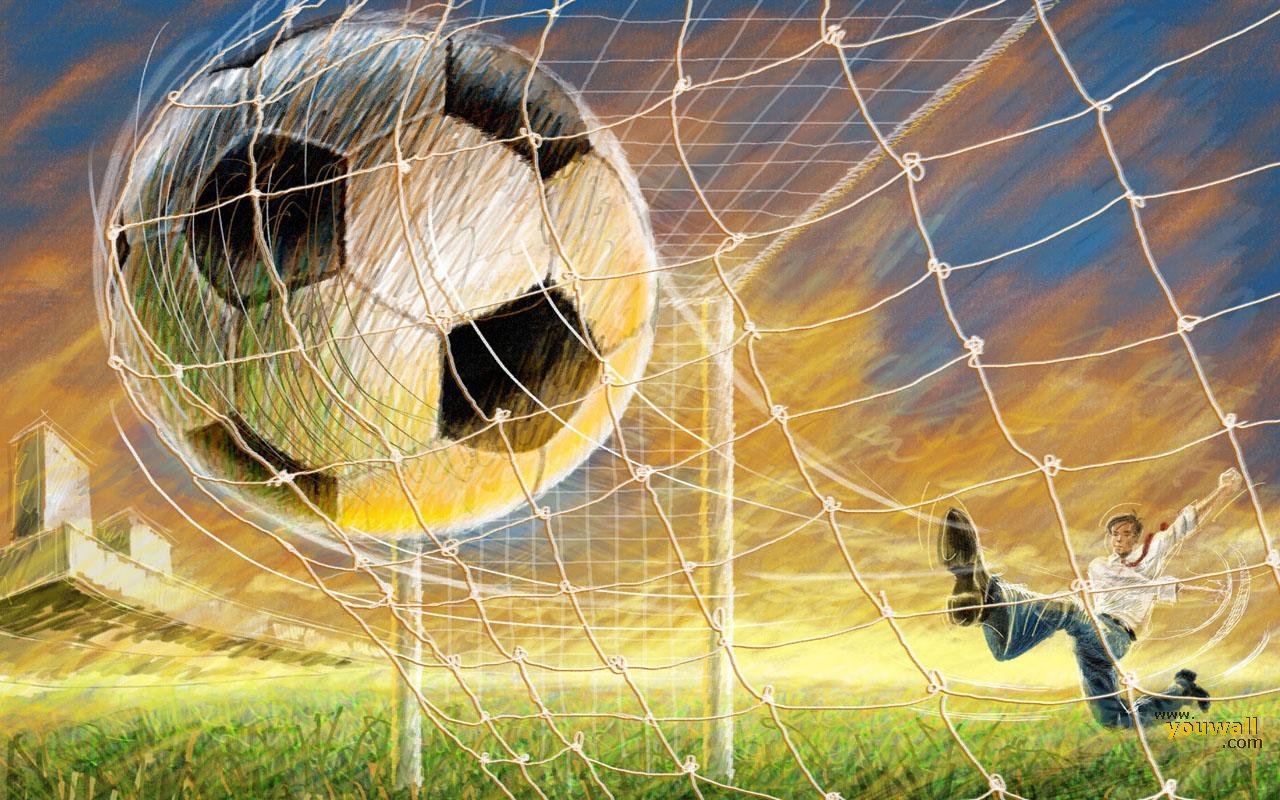 Description: A painting of a soccer ball in a net with a man kicking it in the air behind it.