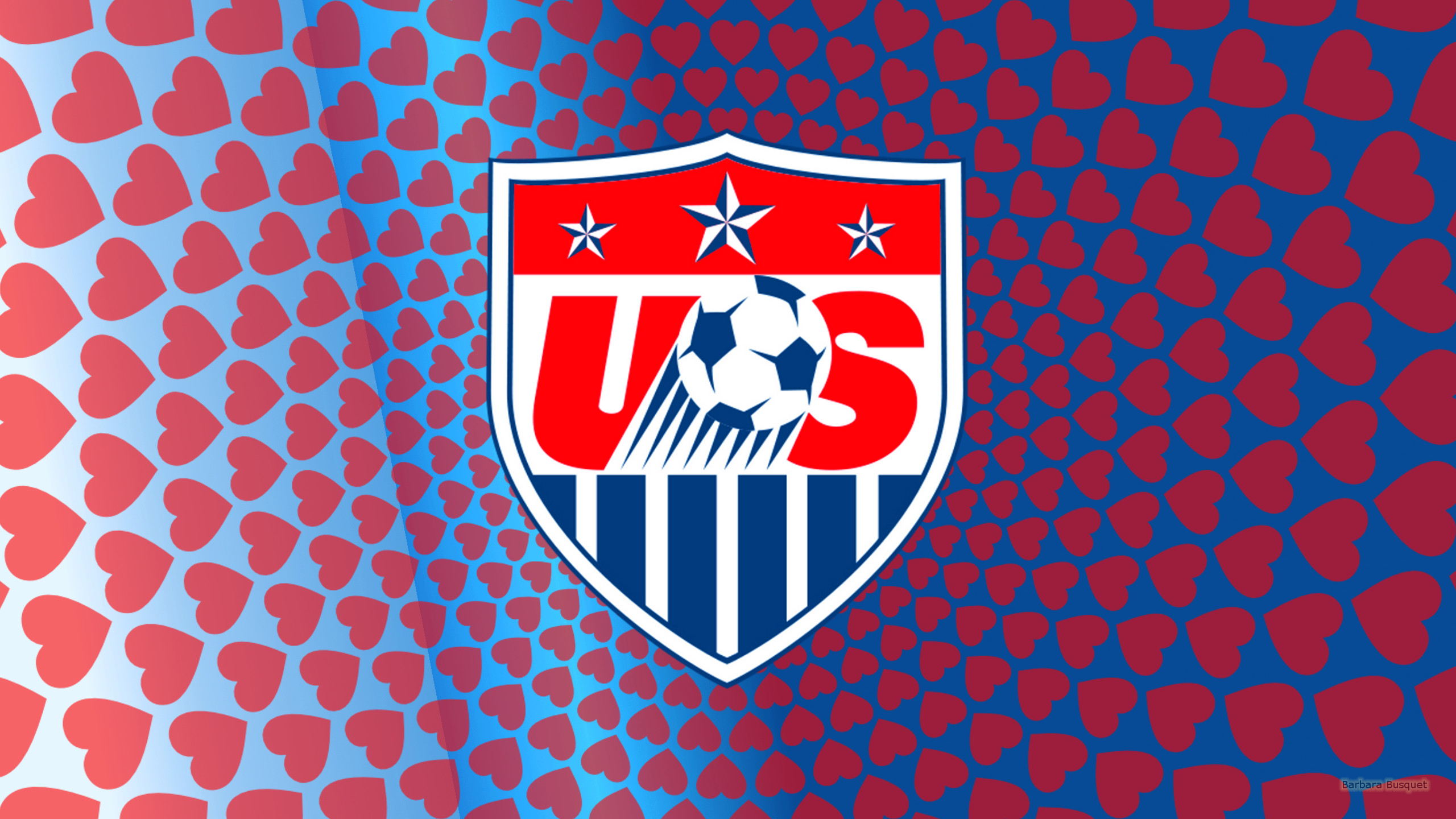 Description: A soccer ball is on a red and blue background with hearts in the background and stars in the middle.