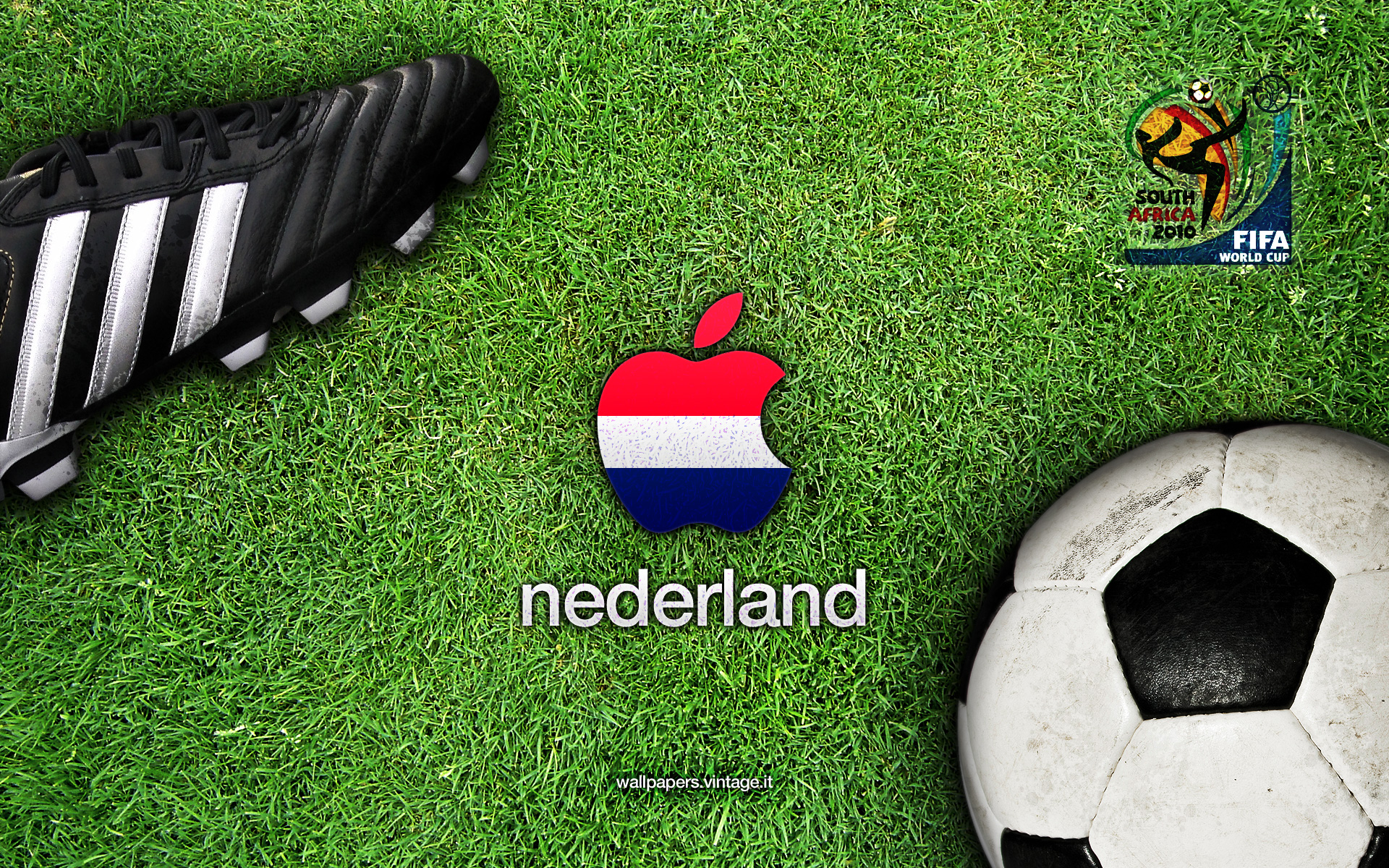 Description: A soccer ball and a soccer shoe on a field of grass with a sticker of the logo of the country of nederland.