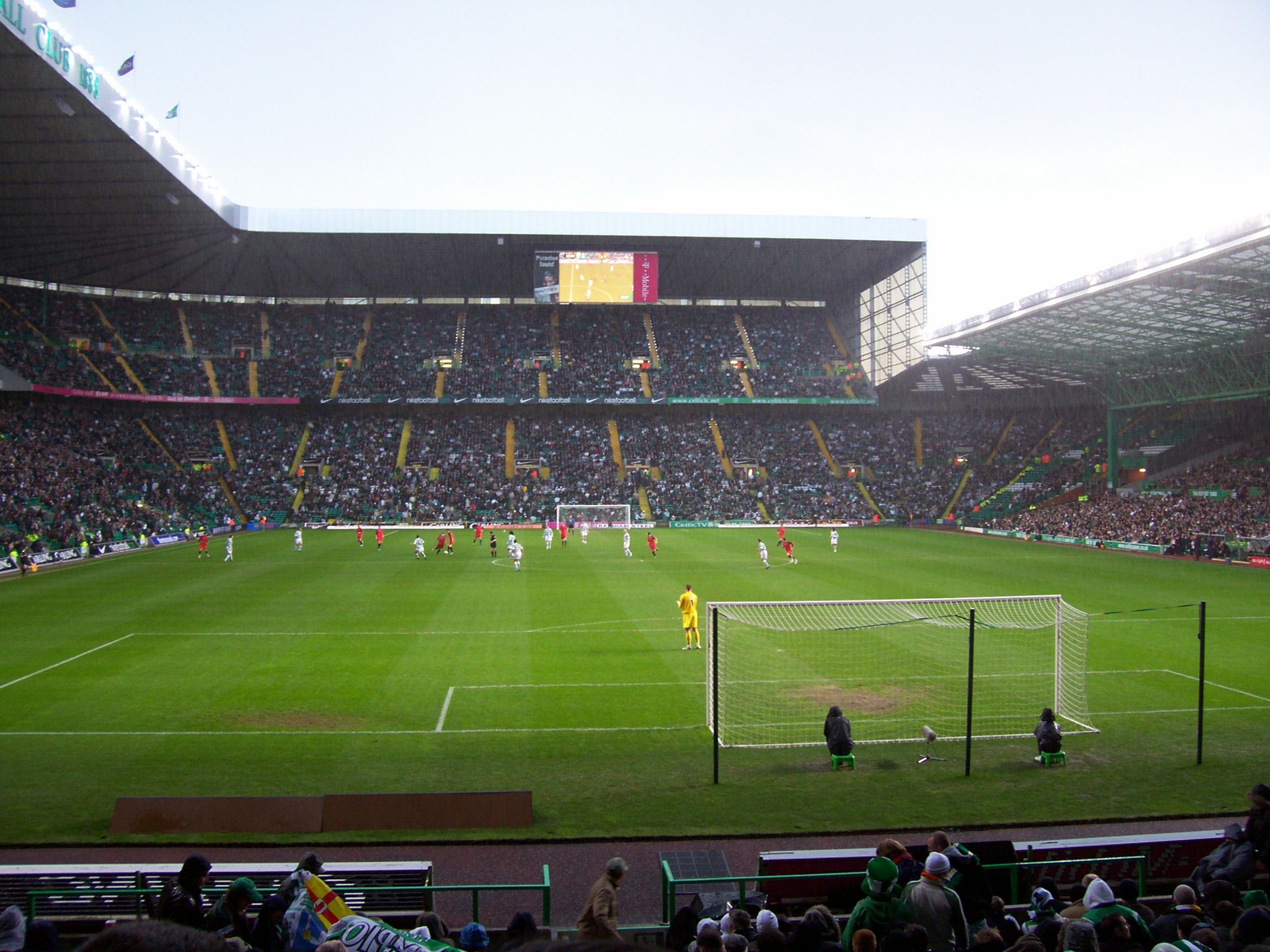 Description: A soccer field with a goalie on it and a crowd of people watching it from the stands at a stadium.
