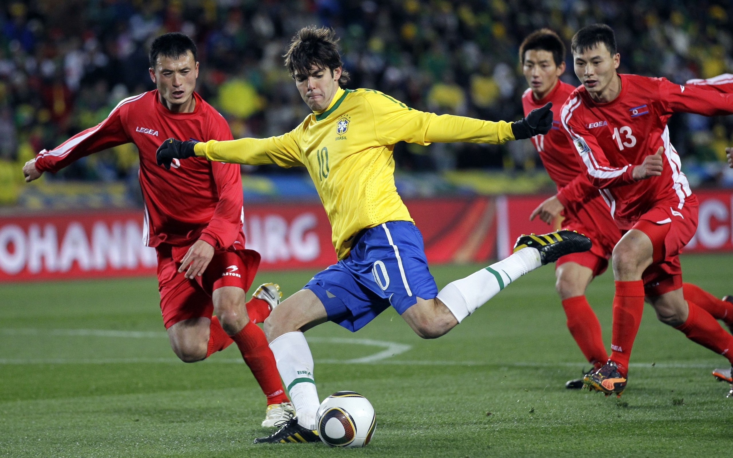 Description: A group of men playing a game of soccer on a field with a crowd watching them from the stands.