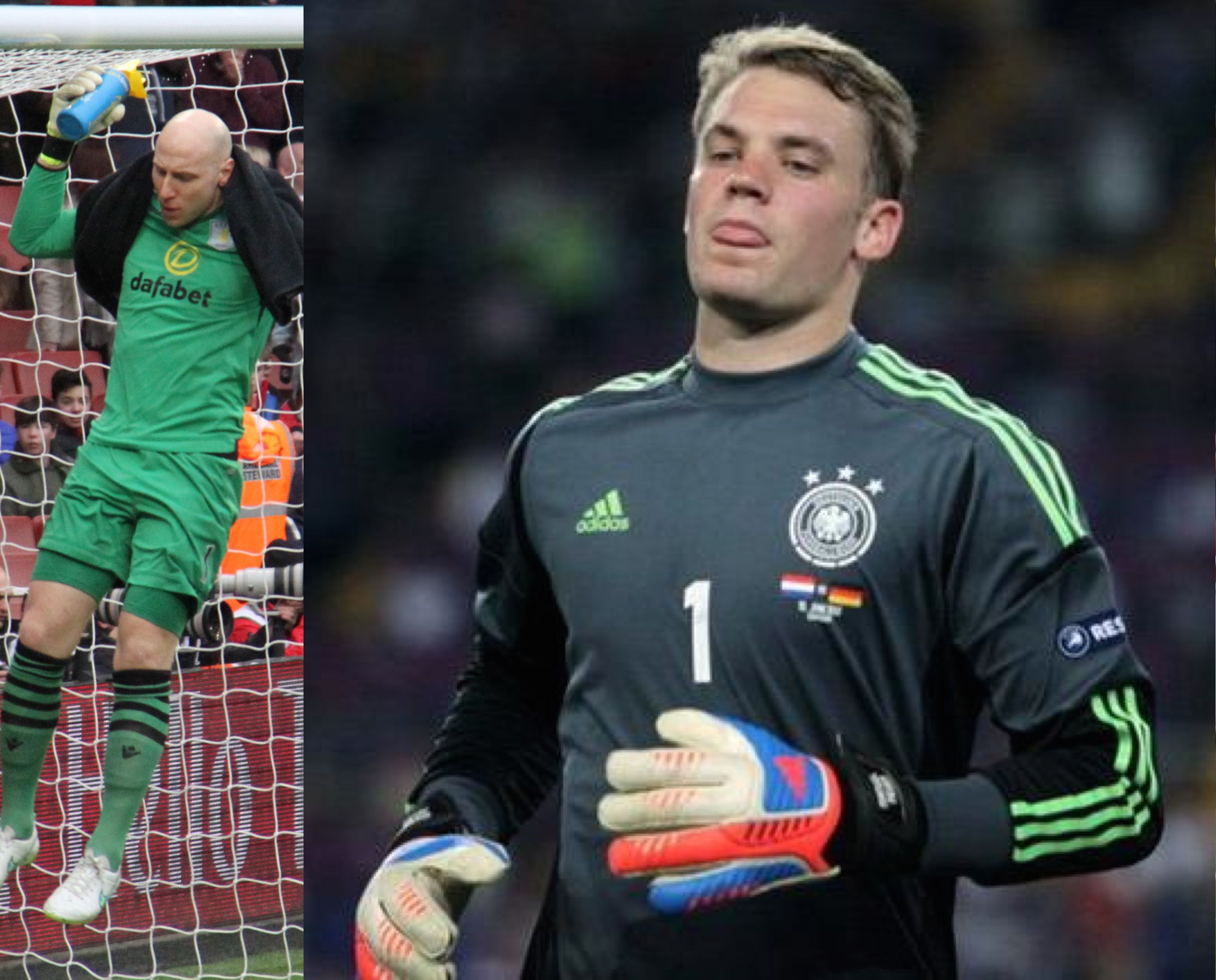 Description: A man in a green uniform is playing soccer and a man in a black shirt is wearing a green uniform.