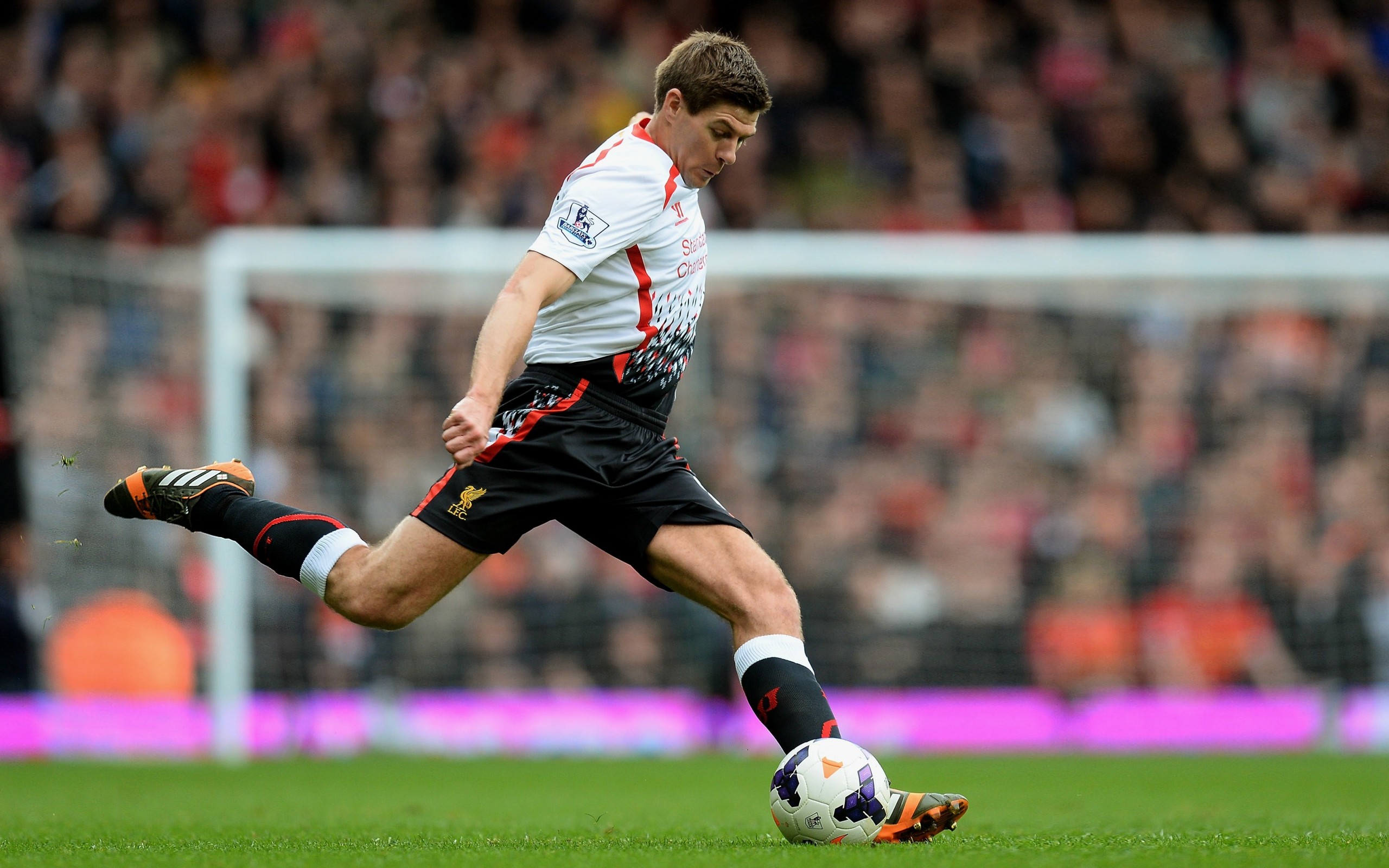 Description: A man kicking a soccer ball on a field with a crowd watching him from the stands in the stands.