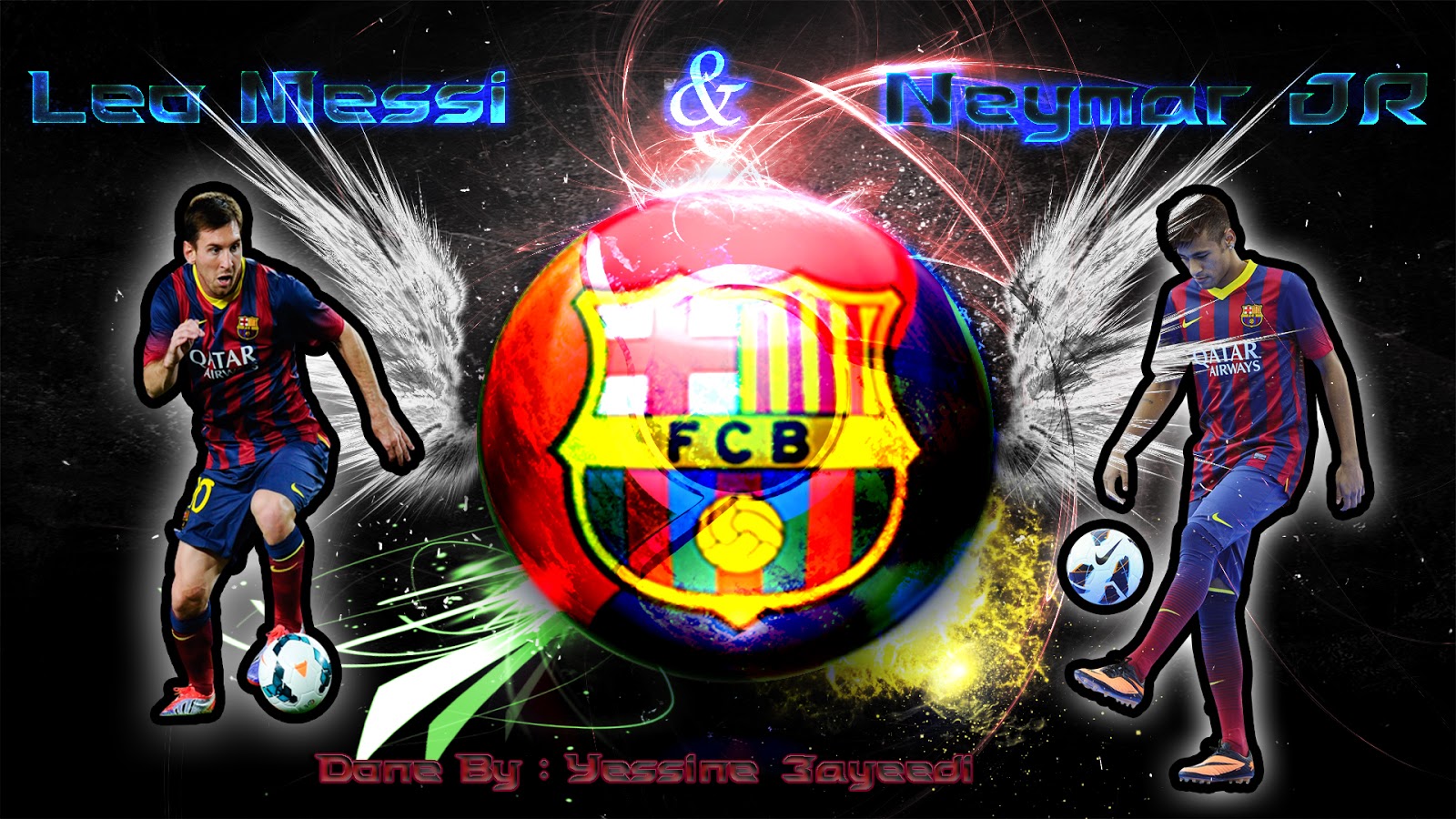 Description: A picture of a soccer player and a ball with wings on it and a name on it that says leo messi and neym cr.