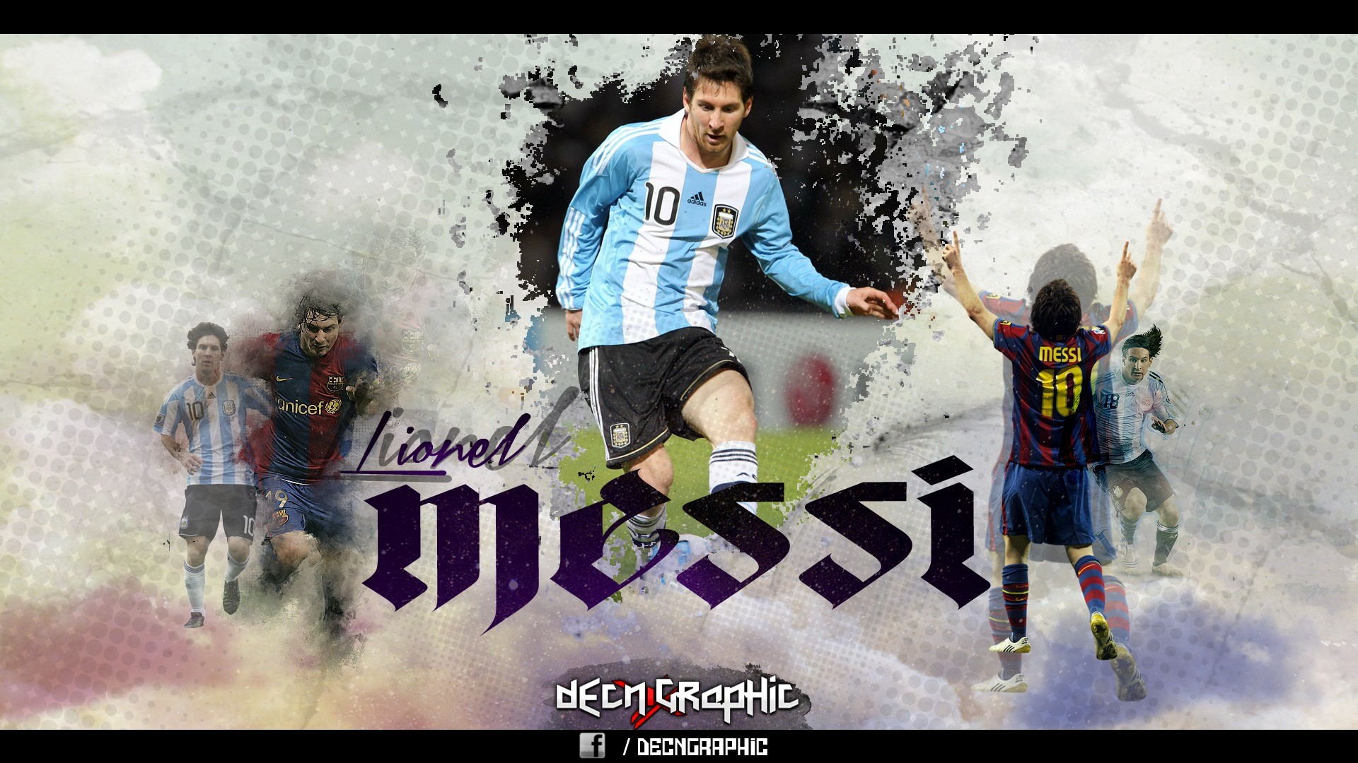Description: A soccer player is kicking a ball in front of a group of other players in a graphic style with the word messi.