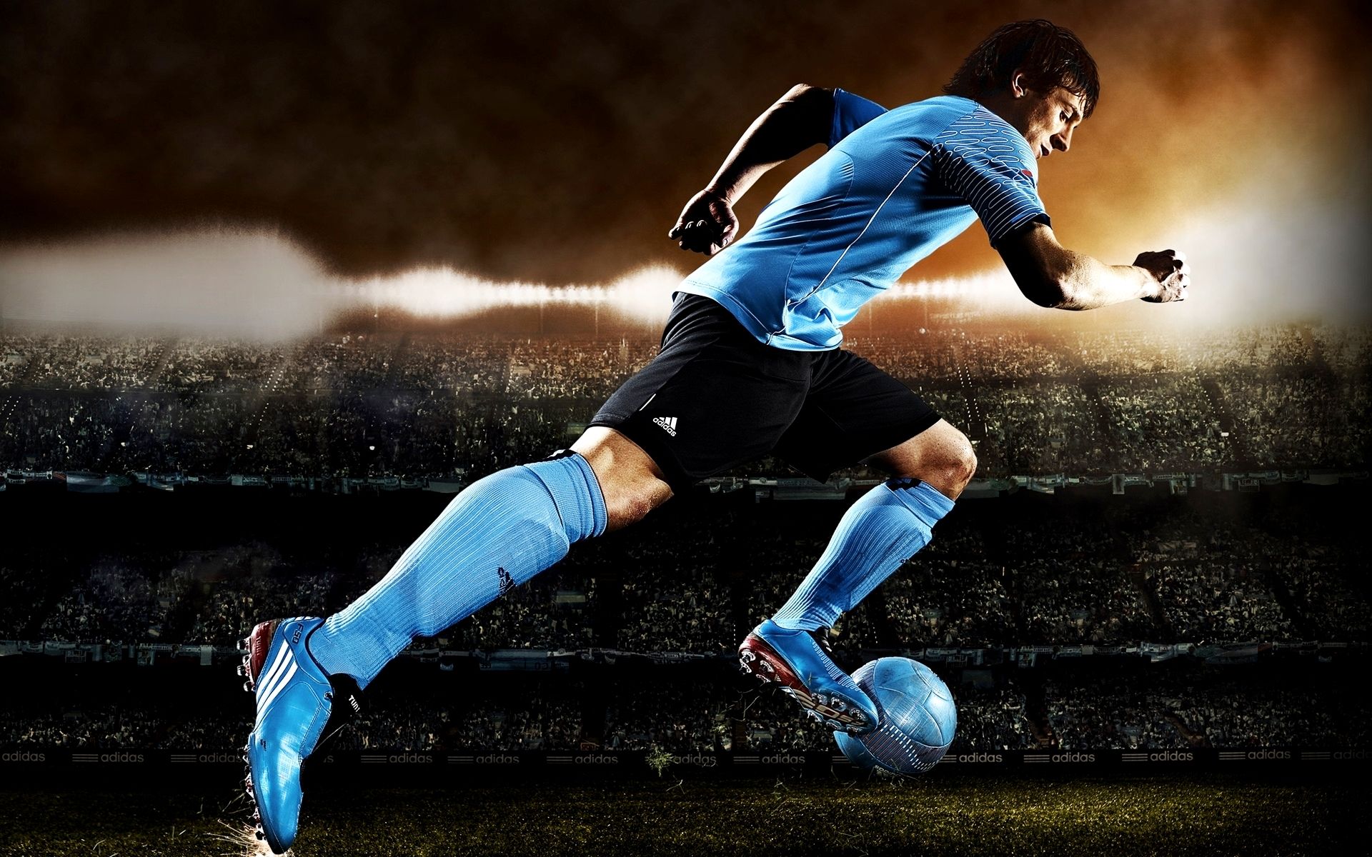 Description: A soccer player kicking a soccer ball on a field of a stadium with a sky background and a stadium full of people.