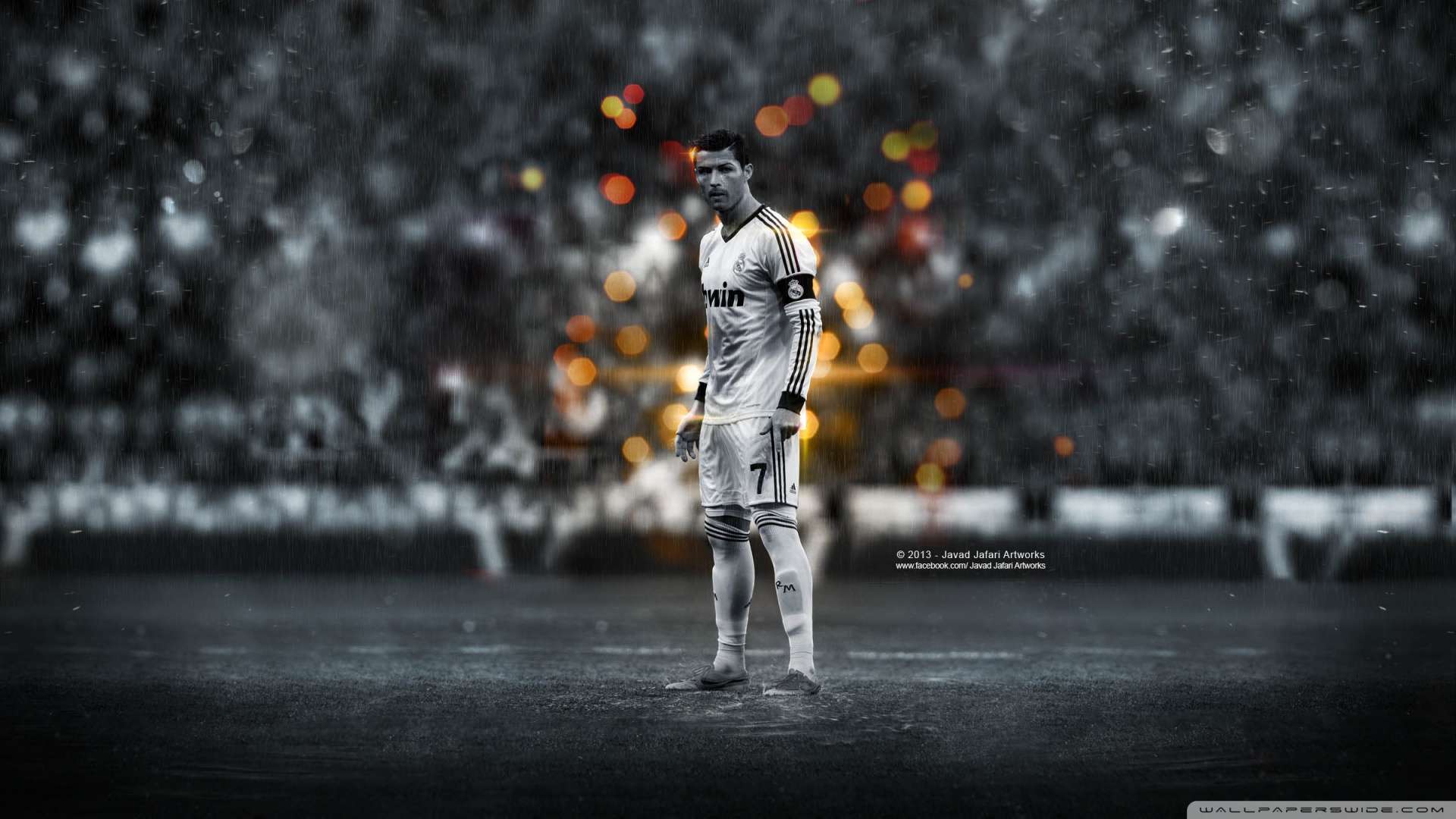Description: A soccer player standing on a field in the rain with a ball in his hand and a stadium in the background.