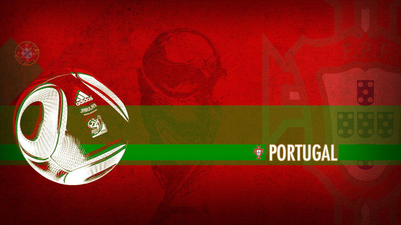 Description: A soccer ball with portugal on it is in front of a red background with a green stripe and a red and white soccer ball.