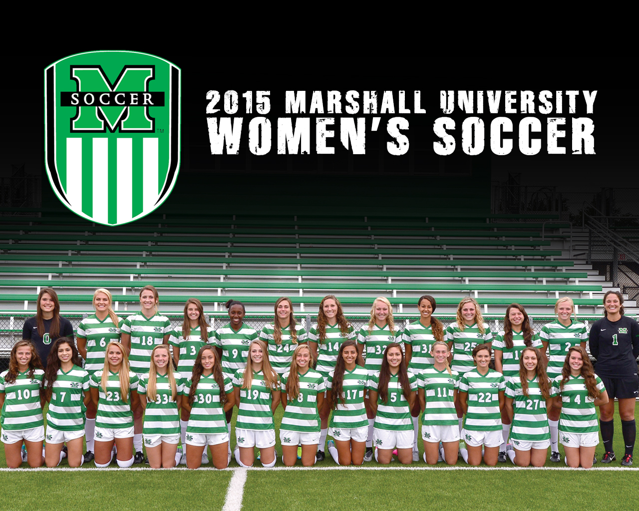 Description: A soccer team is posing for a team photo on the field with the words.