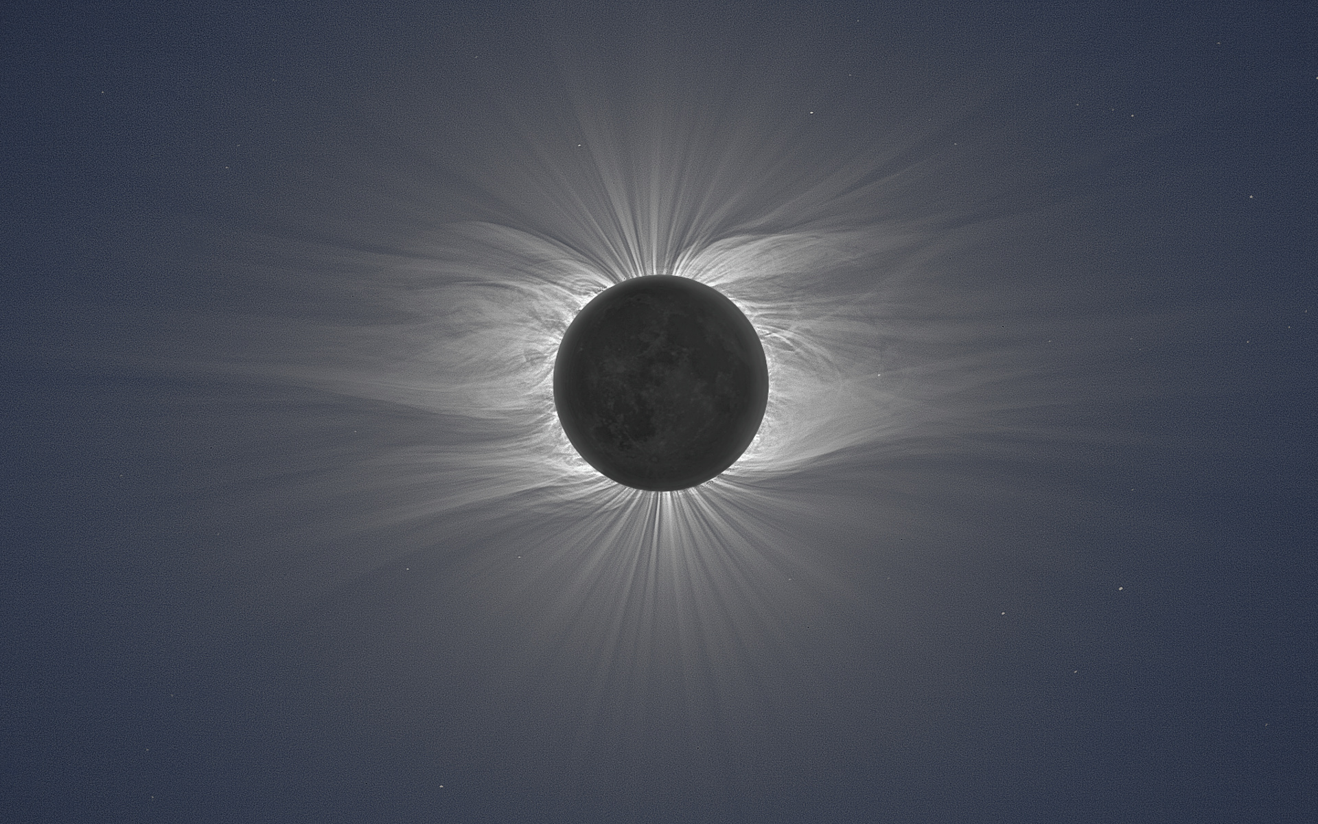 Description: A solar eclipse seen from space with a bright sun behind it and a dark blue sky with stars in the background.