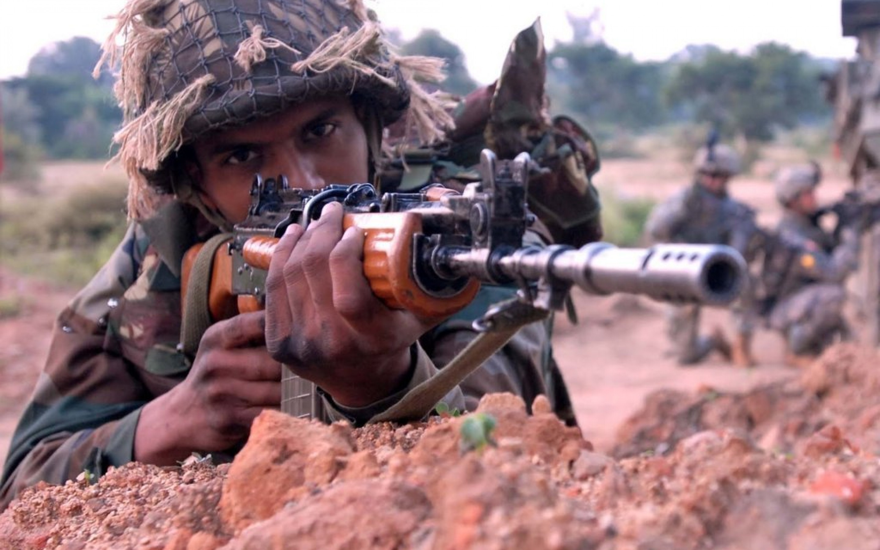 Description: A soldier with a gun in his hand and another soldier in the background with a gun in his hand.