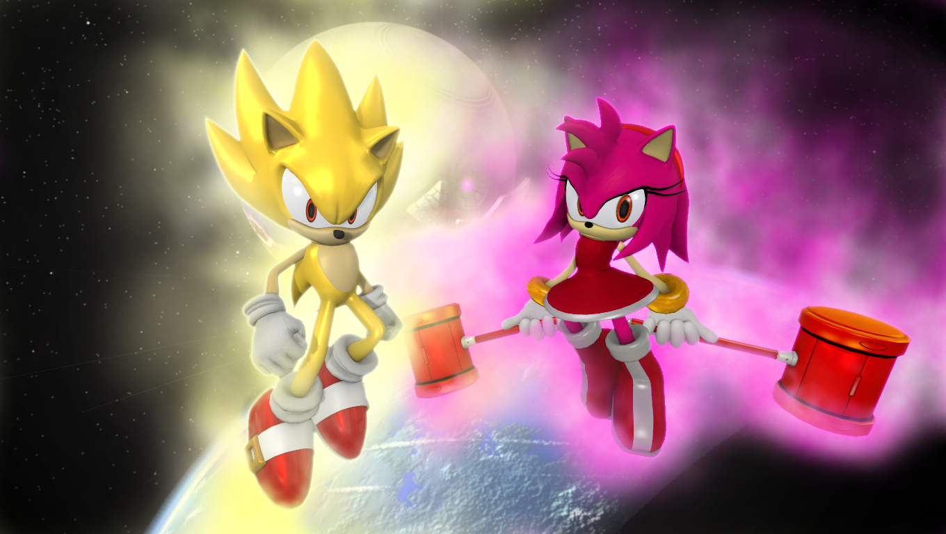 Description: Two sonic characters are flying through the air with a bucket of paint on their feet and a planet in the background.