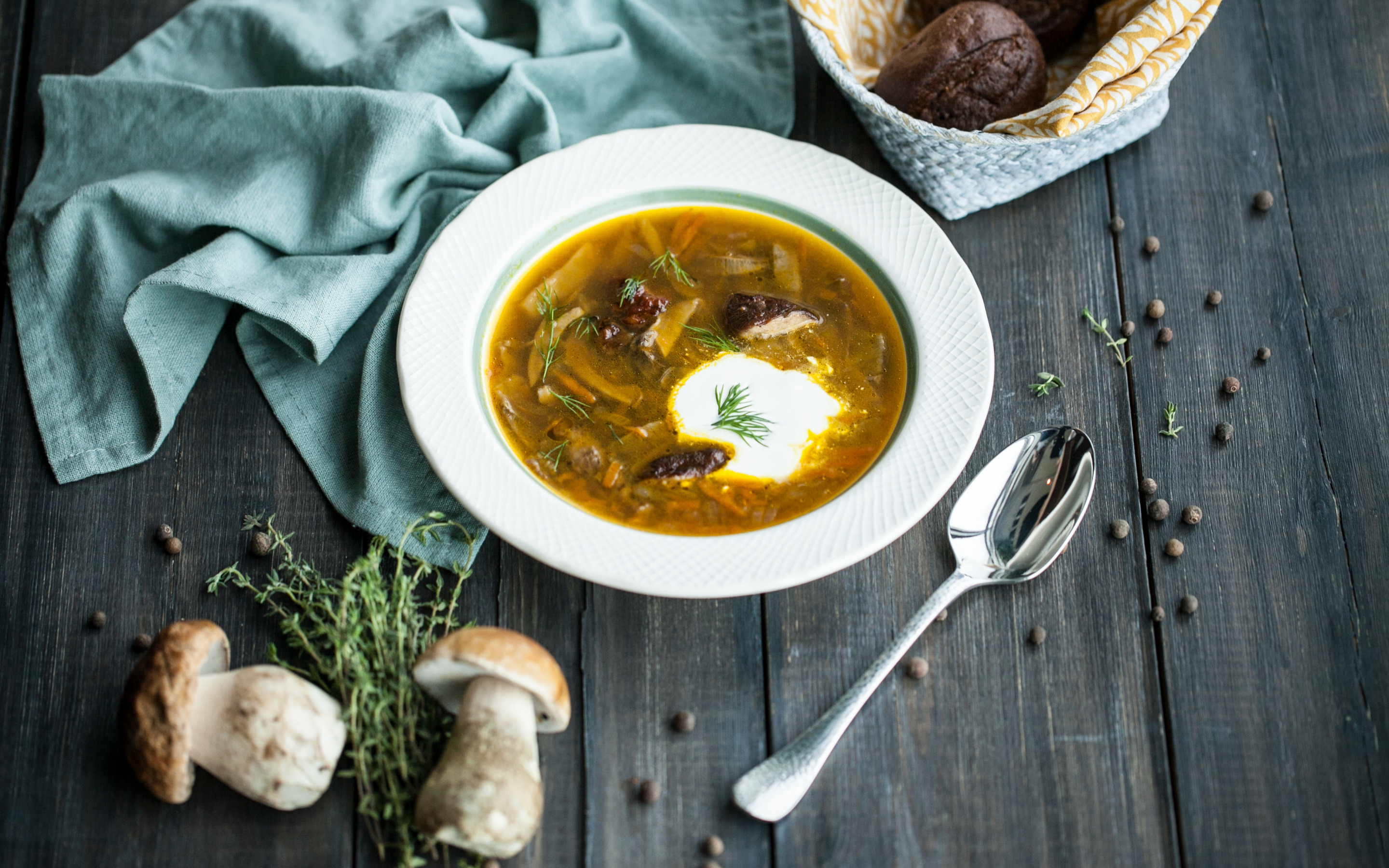 Description: A bowl of soup with a spoon and spoon rest on a table next to a basket of mushrooms and a napkin.
