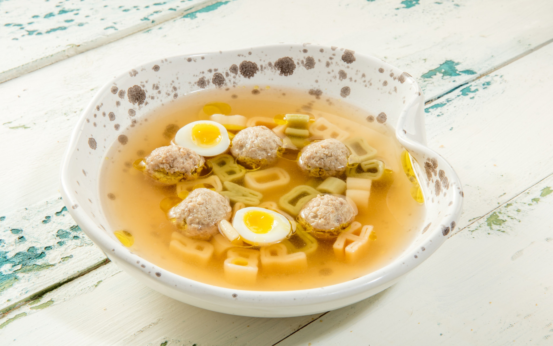 Description: A bowl of soup with meatballs and noodles in it on a table top with a spoon and a spoon.