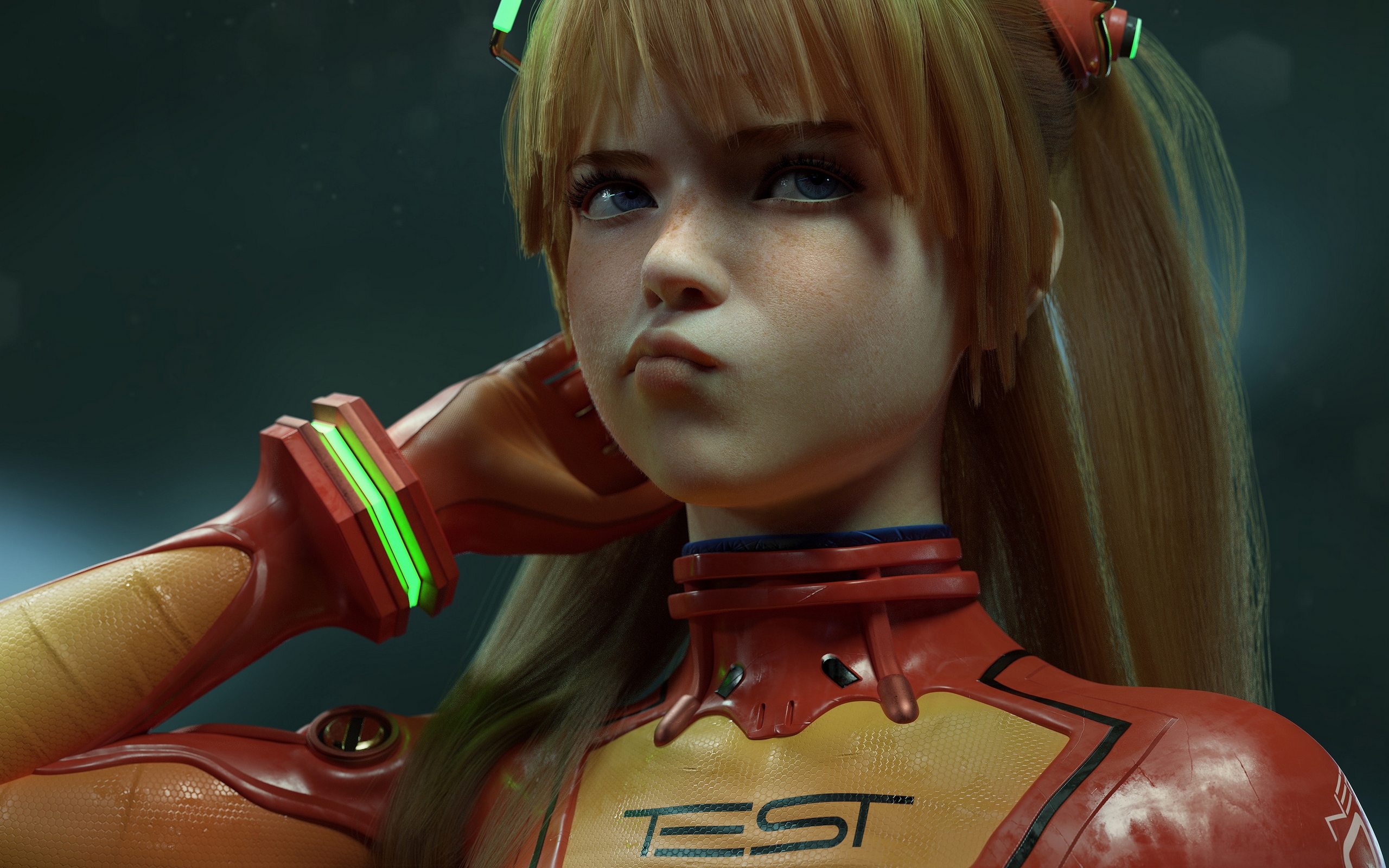 Description: A woman with long hair and a red outfit with a green light on her head and a green light on her arm.