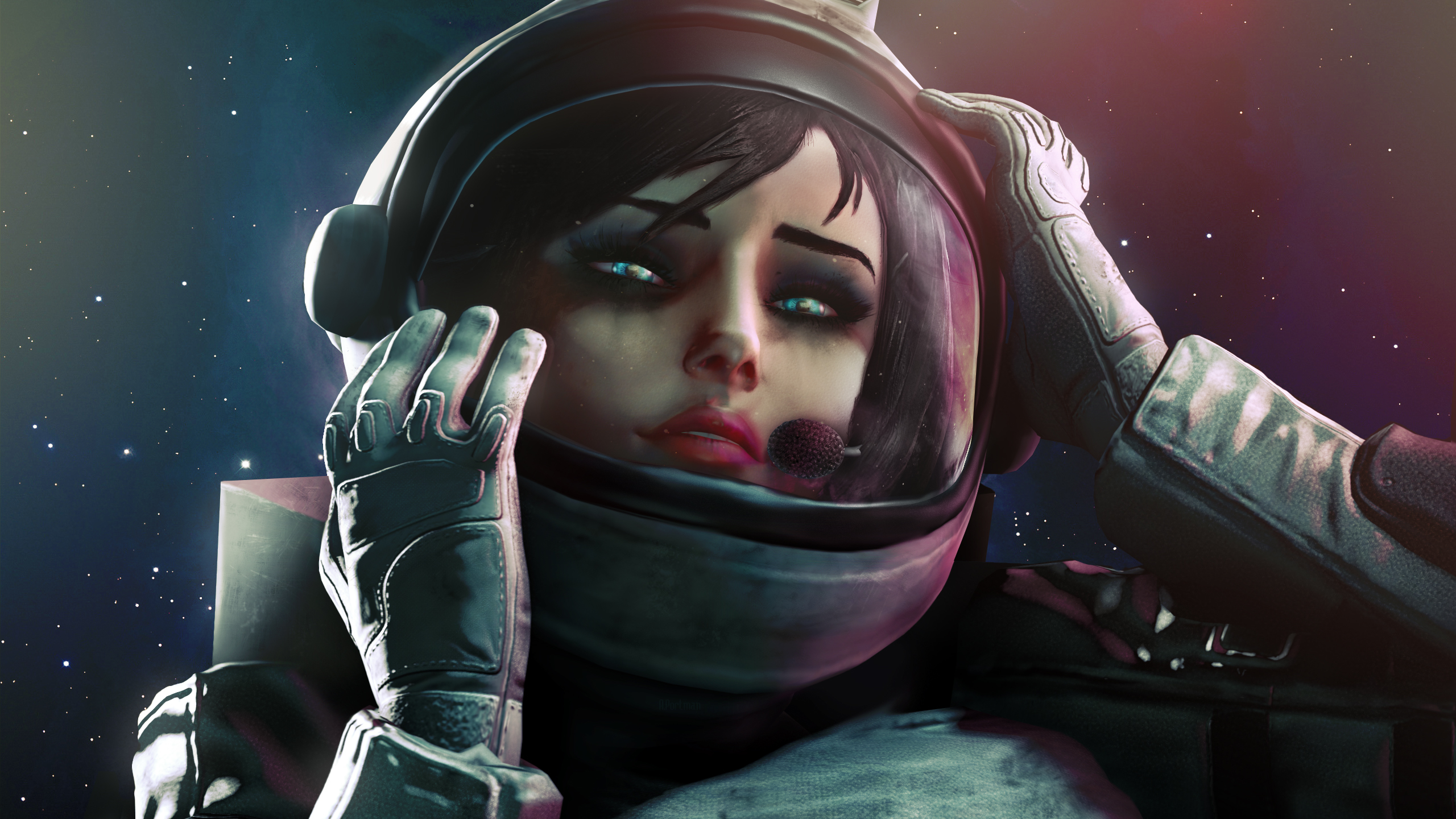 Description: A woman in a space suit holding her head with her hands and looking at the camera with a space background.