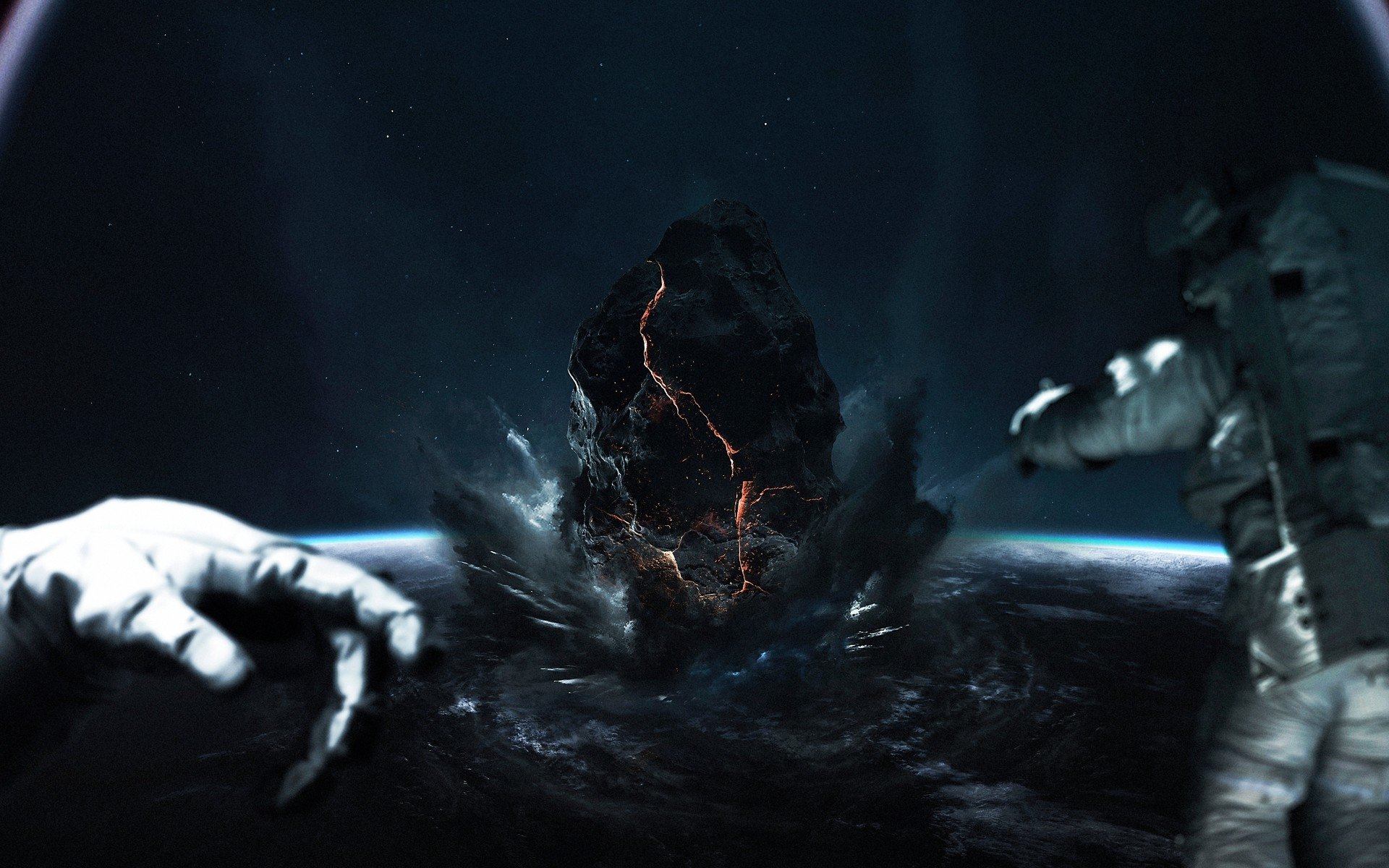 Description: A man in space suit standing next to a rock formation in the sky with a hand reaching out towards it.