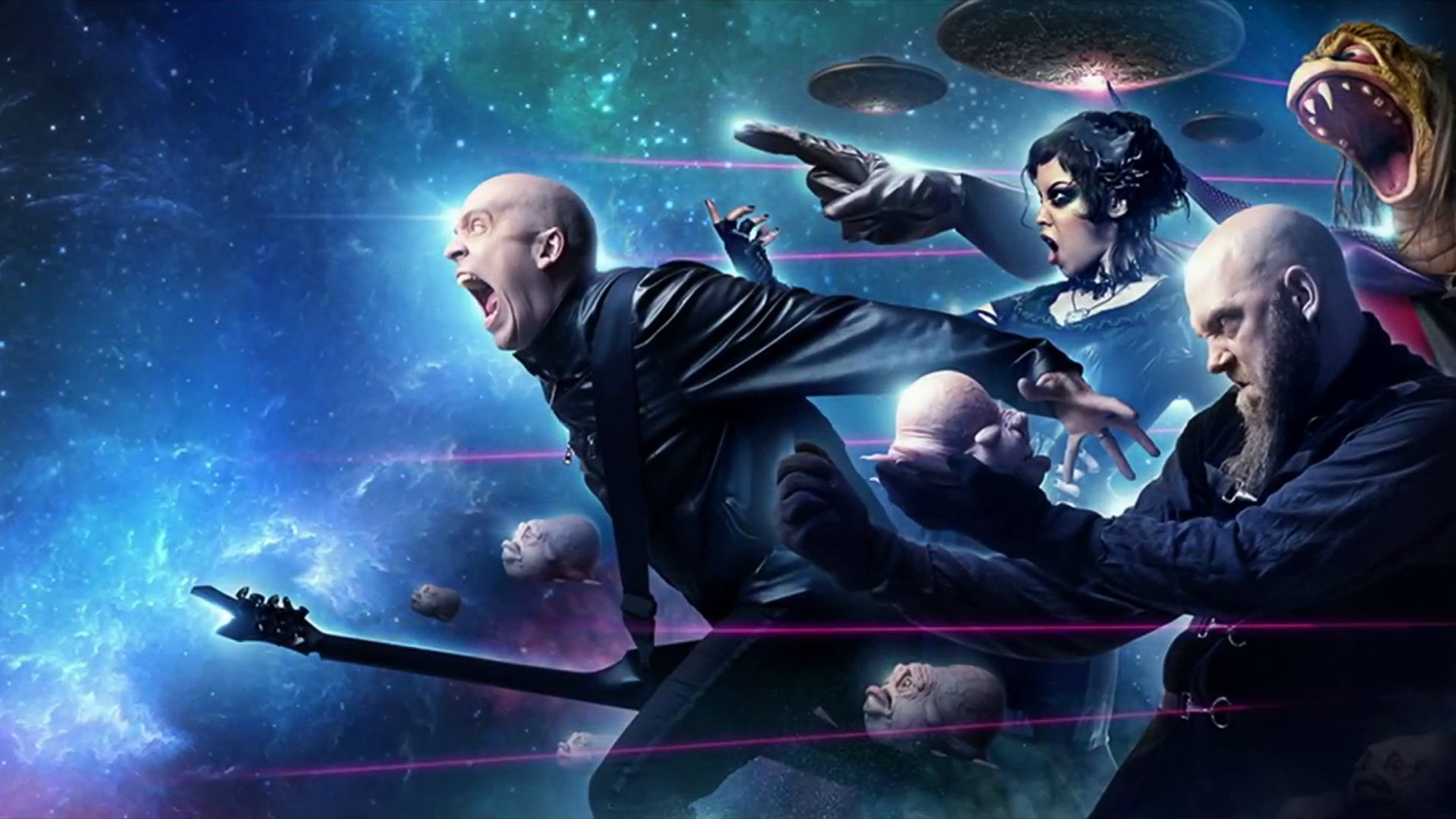 Description: A group of people in space with a background of stars and planets in the background.