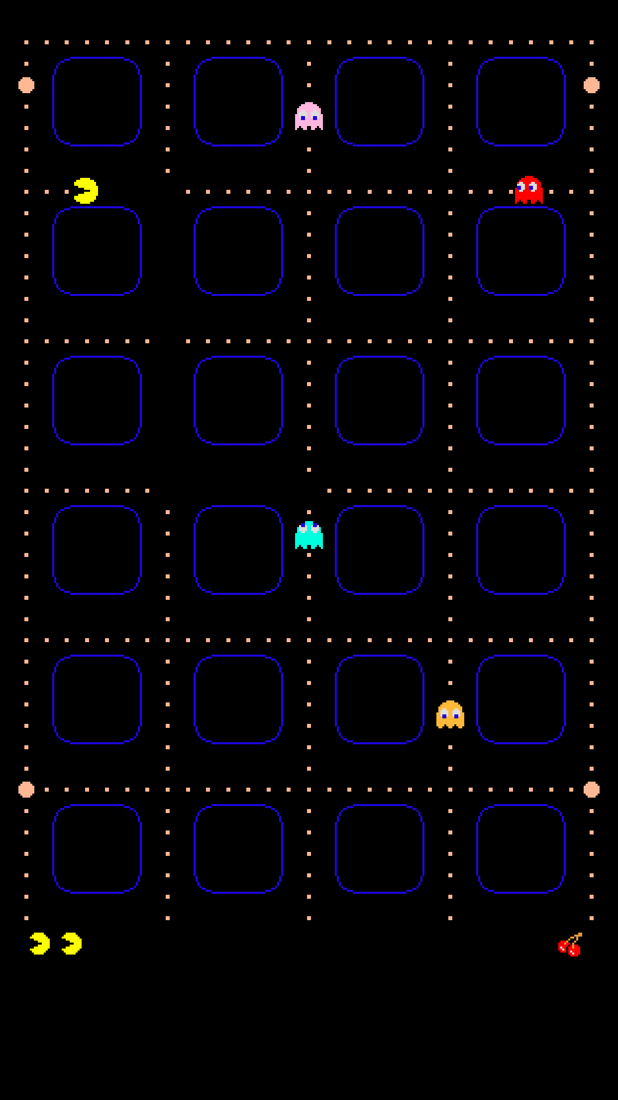 Description: A game screen with a bunch of different objects on it and a black background with blue dots and a red dot.
