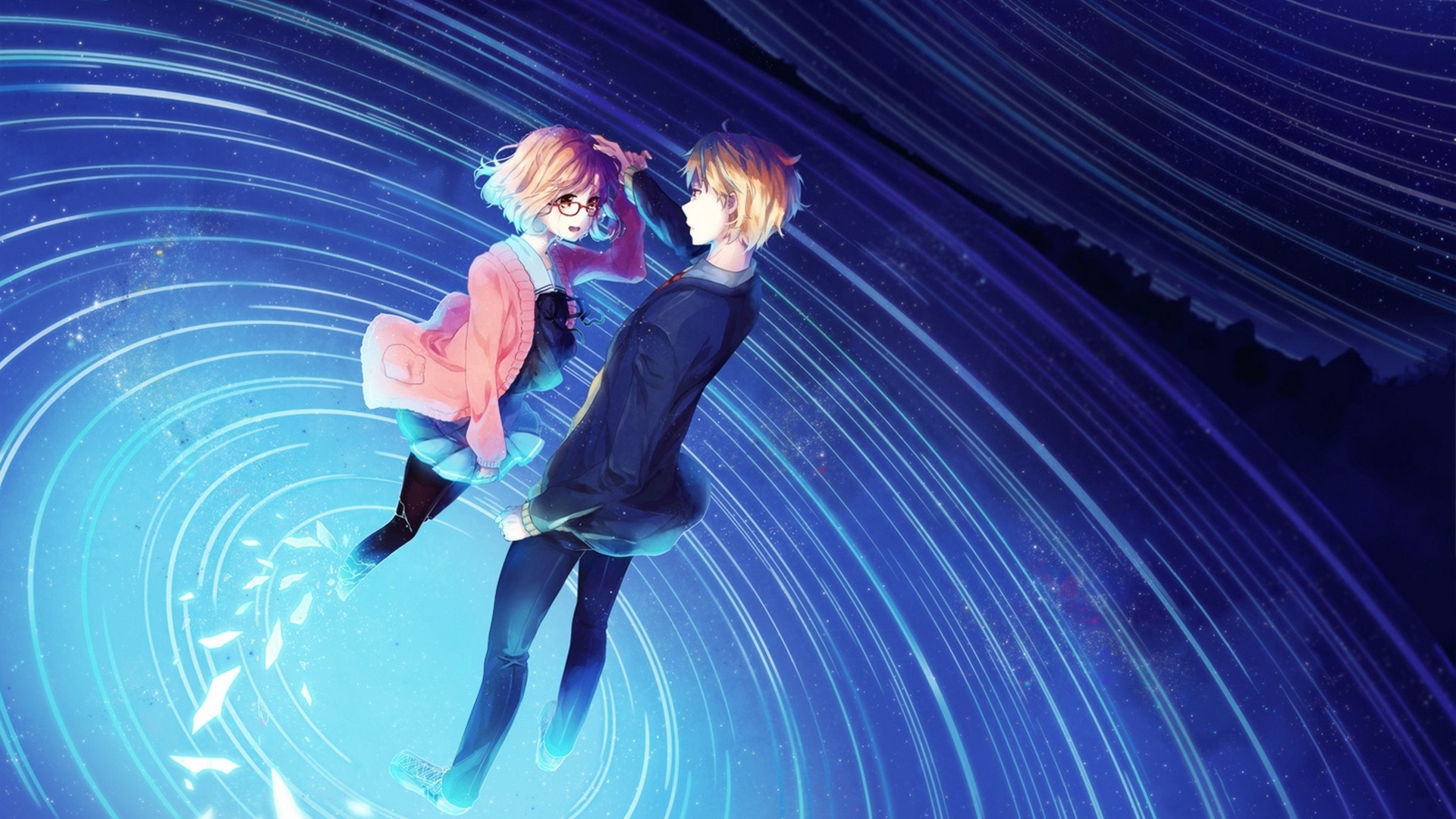 Description: A couple of people standing in a blue tunnel with a sky background and stars in the background and a blue light.