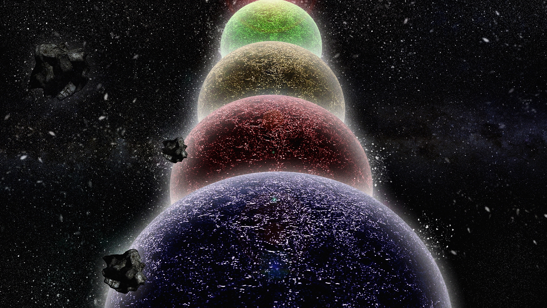 Description: A group of planets in space with stars in the background and a black hole in the middle of the image.