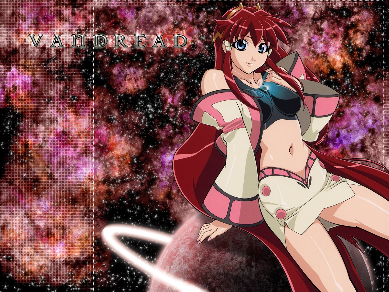 Description: A woman in a bikini and cape flying through the air over a space filled with stars and a pink and purple background.