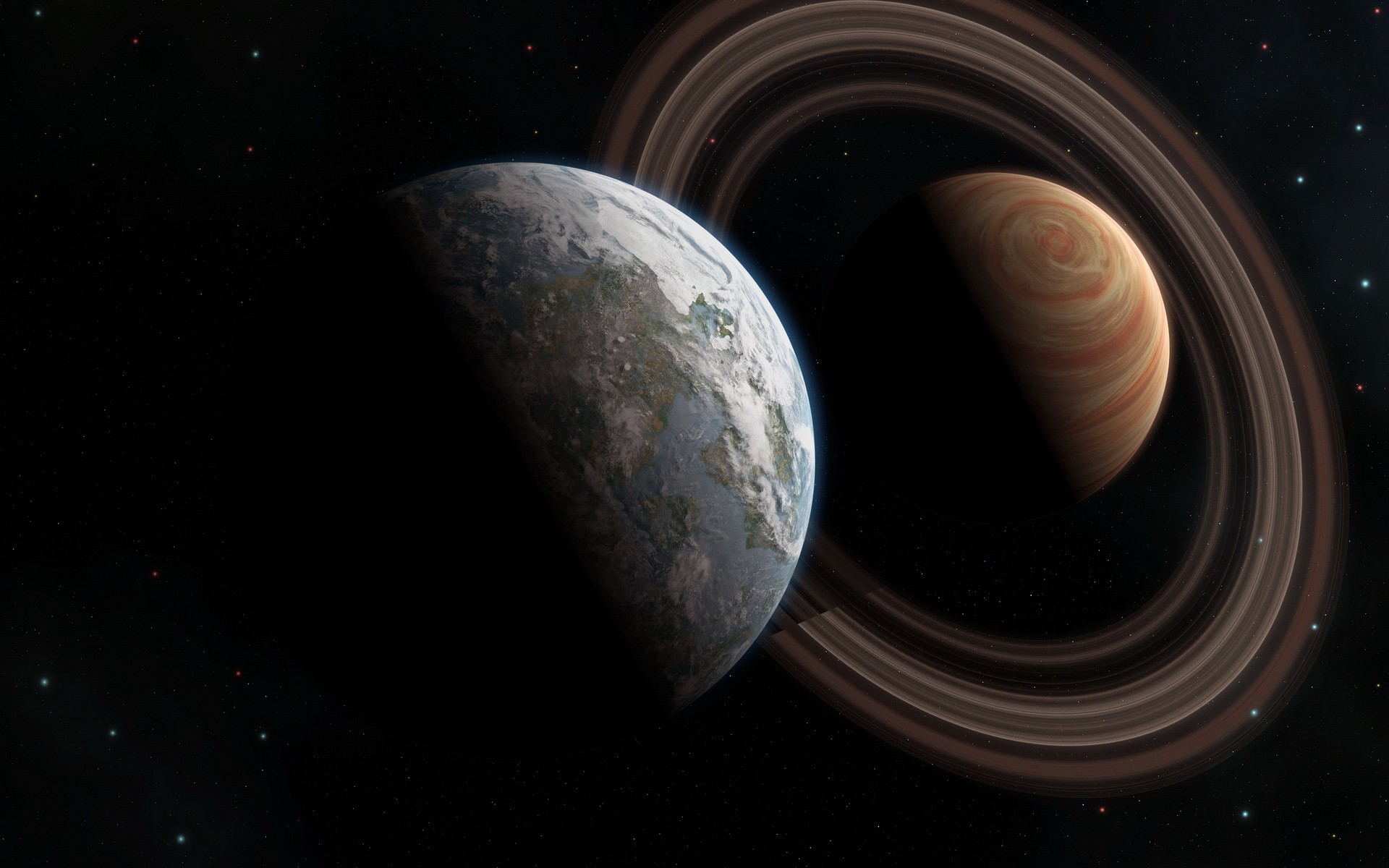 Description: A planet with a ring around it in the sky with stars around it and a star in the background.