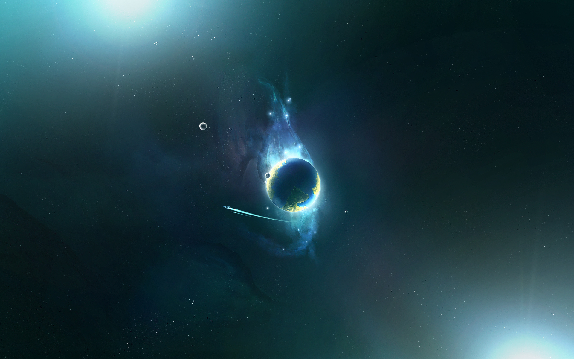 Description: A space scene with a planet and a star in the background with a bright light coming from the center.
