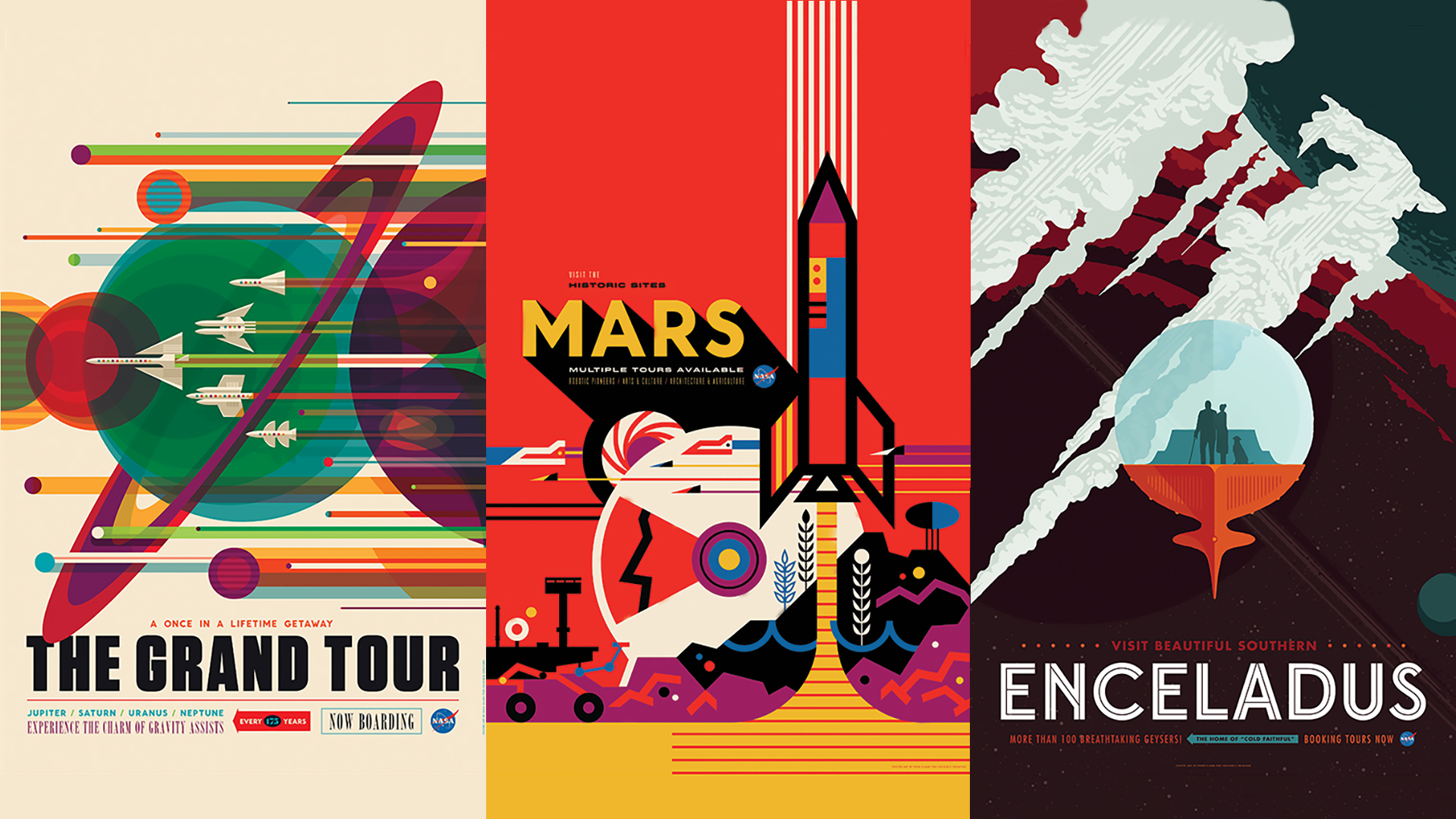 Description: A series of posters with a space theme and a rocket ship in the background.