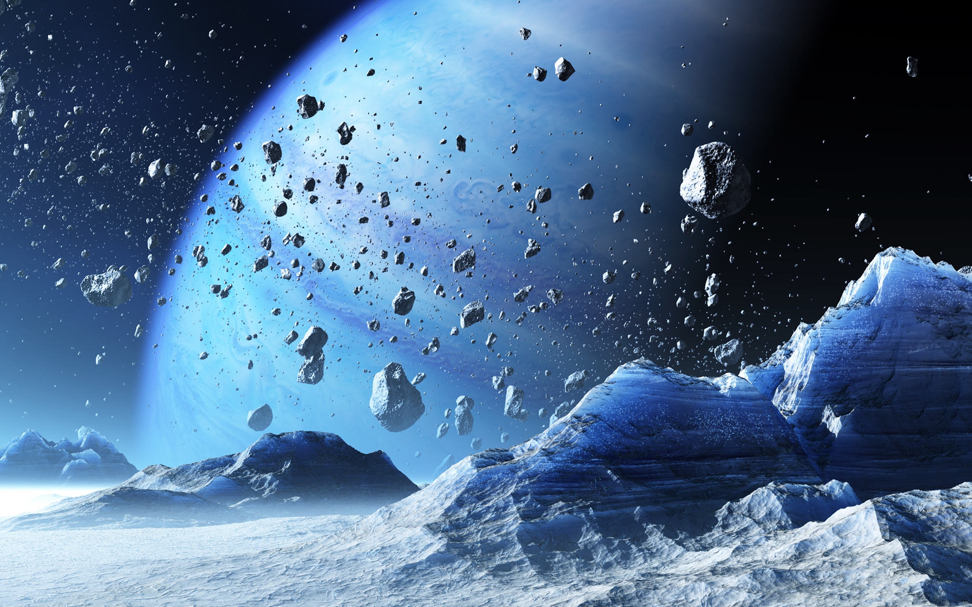 Description: A group of rocks and snow in the middle of a space with a blue planet in the background and a blue sky.