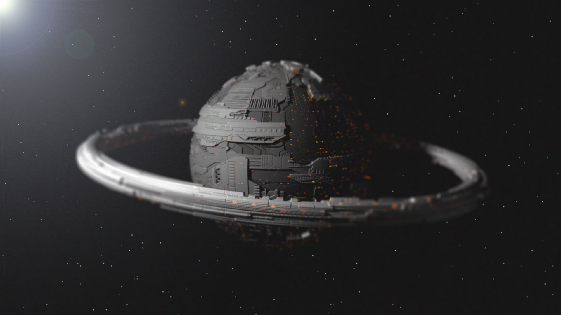 Description: A space ship floating in the air with a bright light above it and a star in the background.